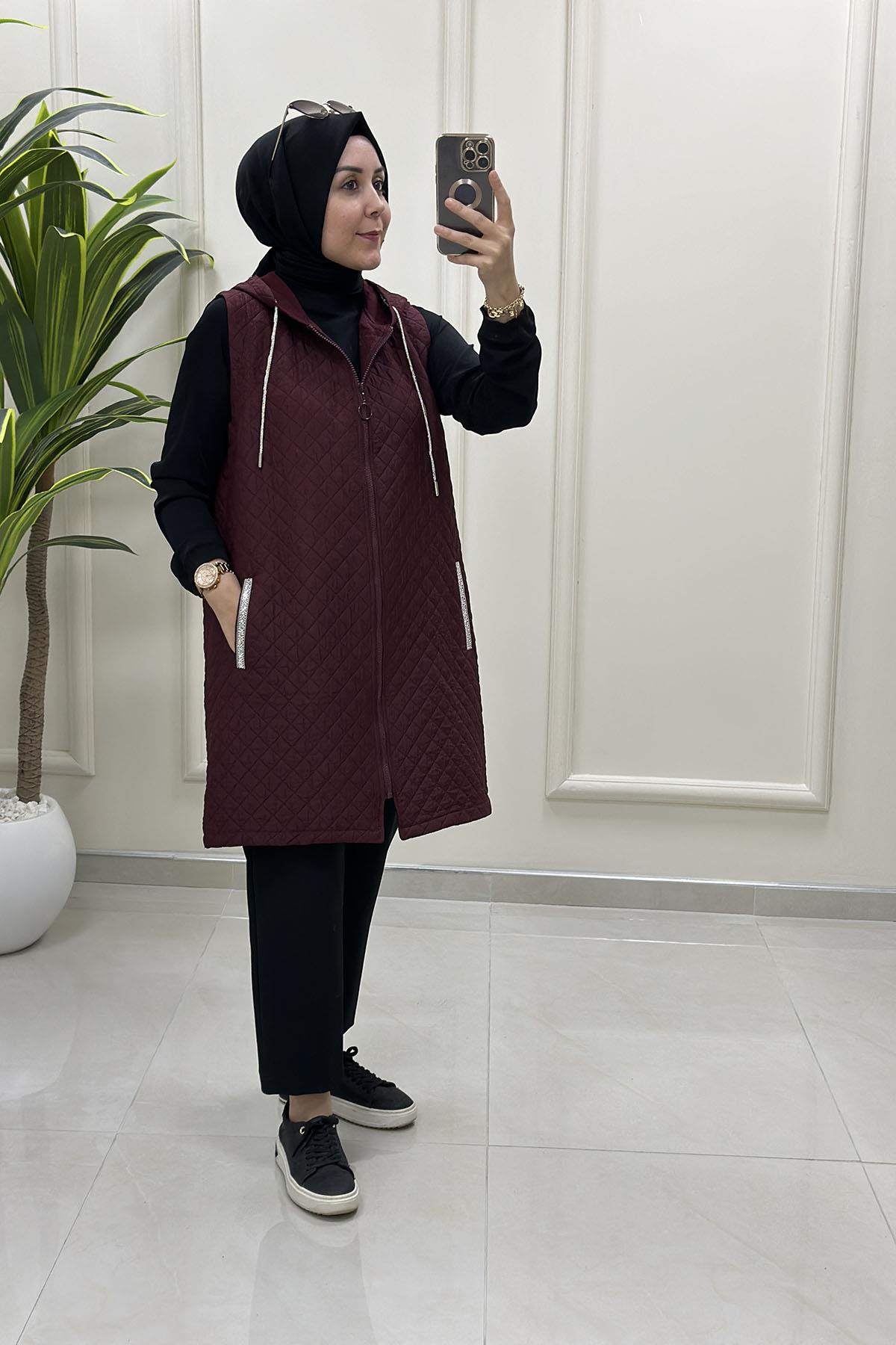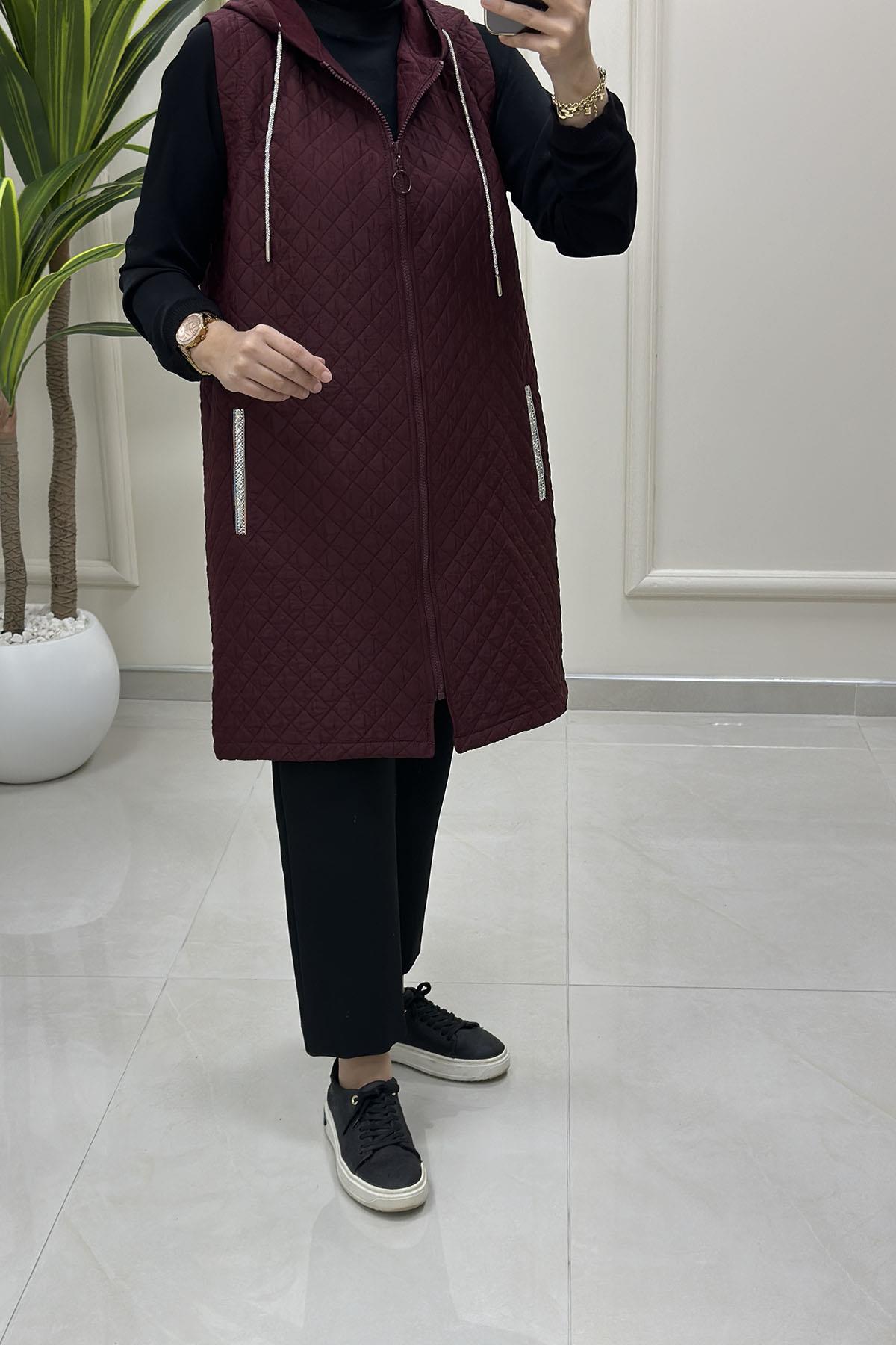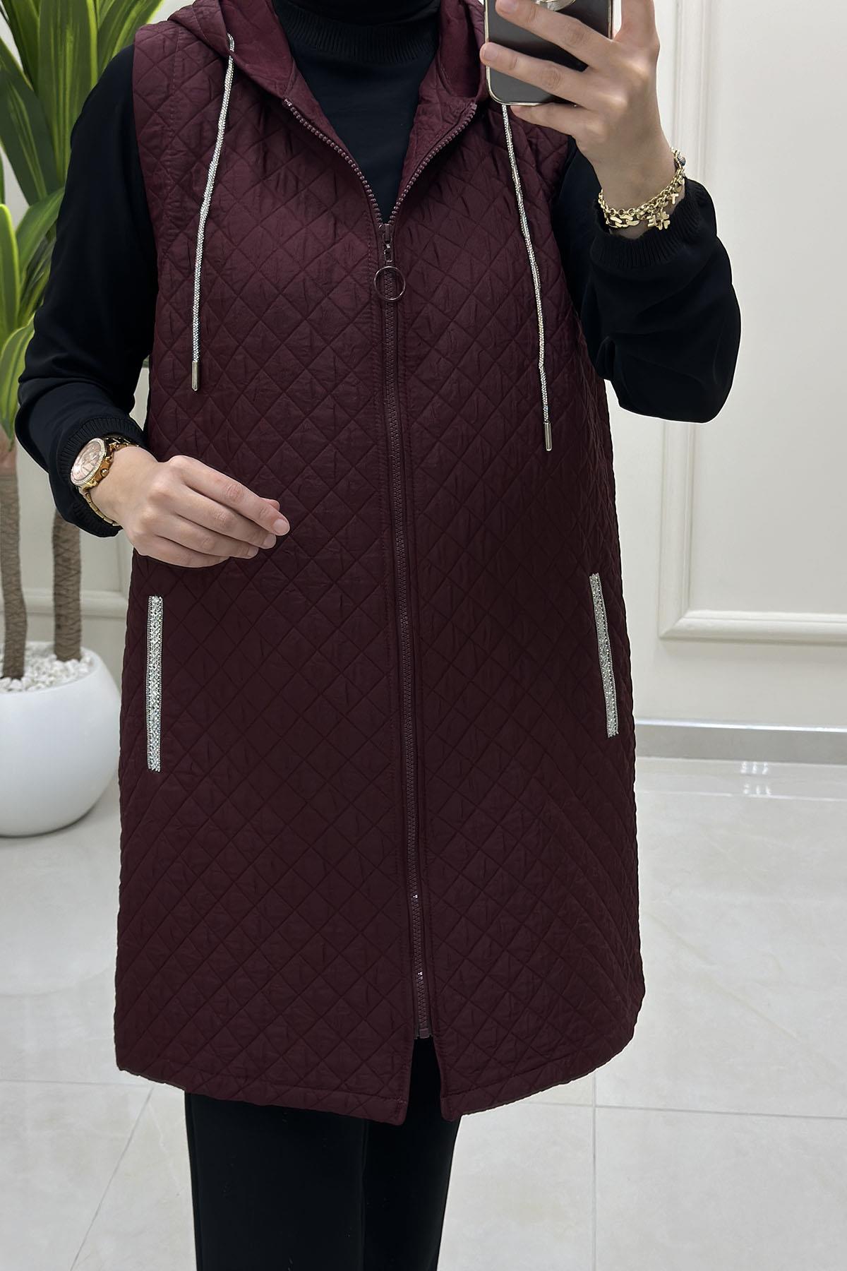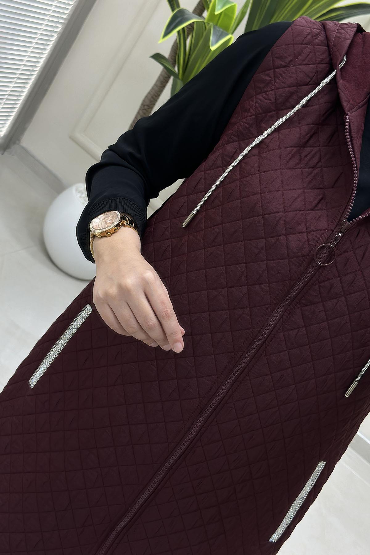 Önü Fermuarlı Kapüşon Taş İpli Kadın Kapitone Yelek Açık Bordo NOŞHE 4468 (NOŞHE-26K4468)