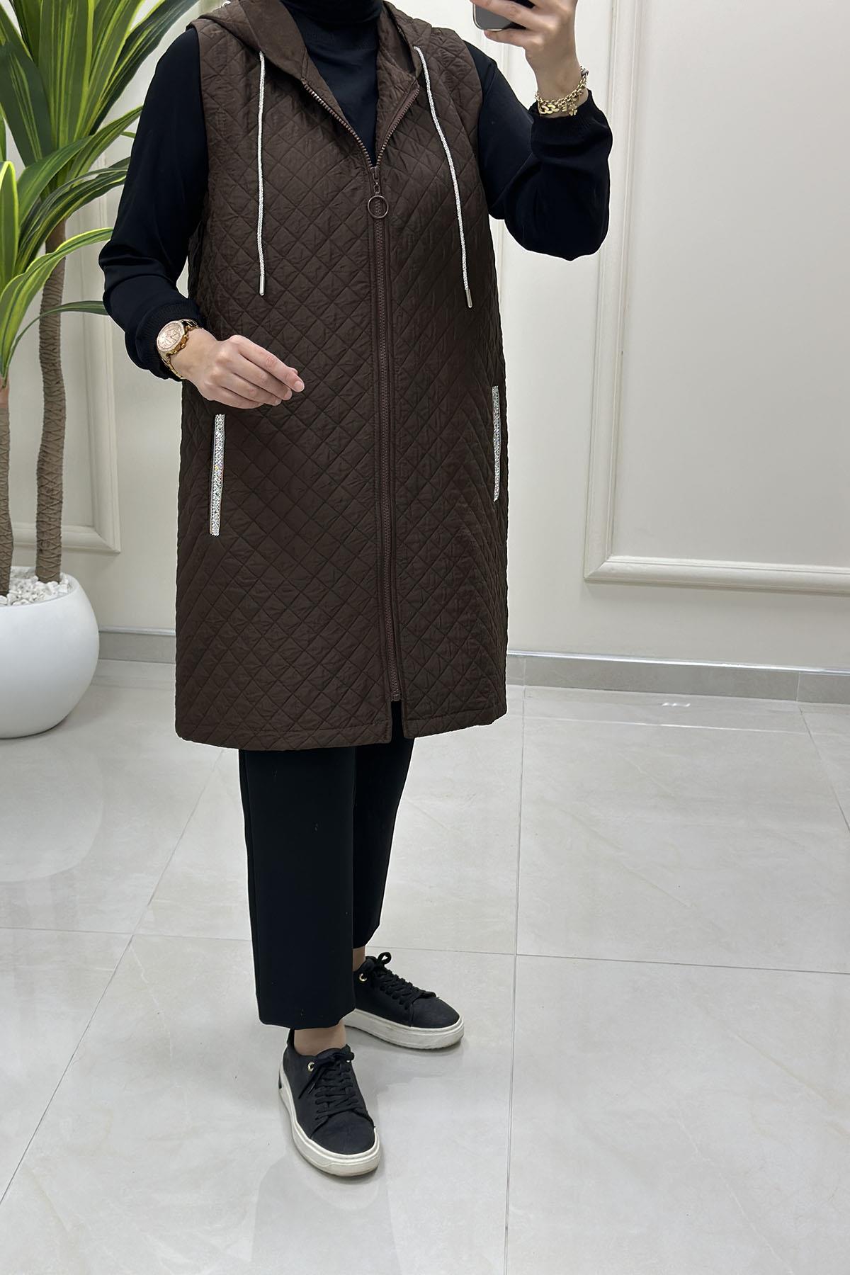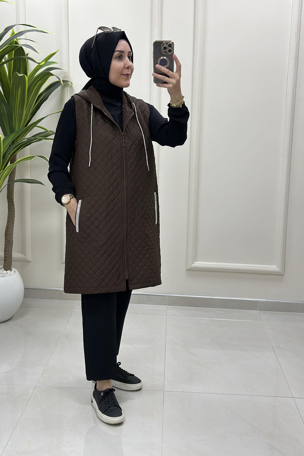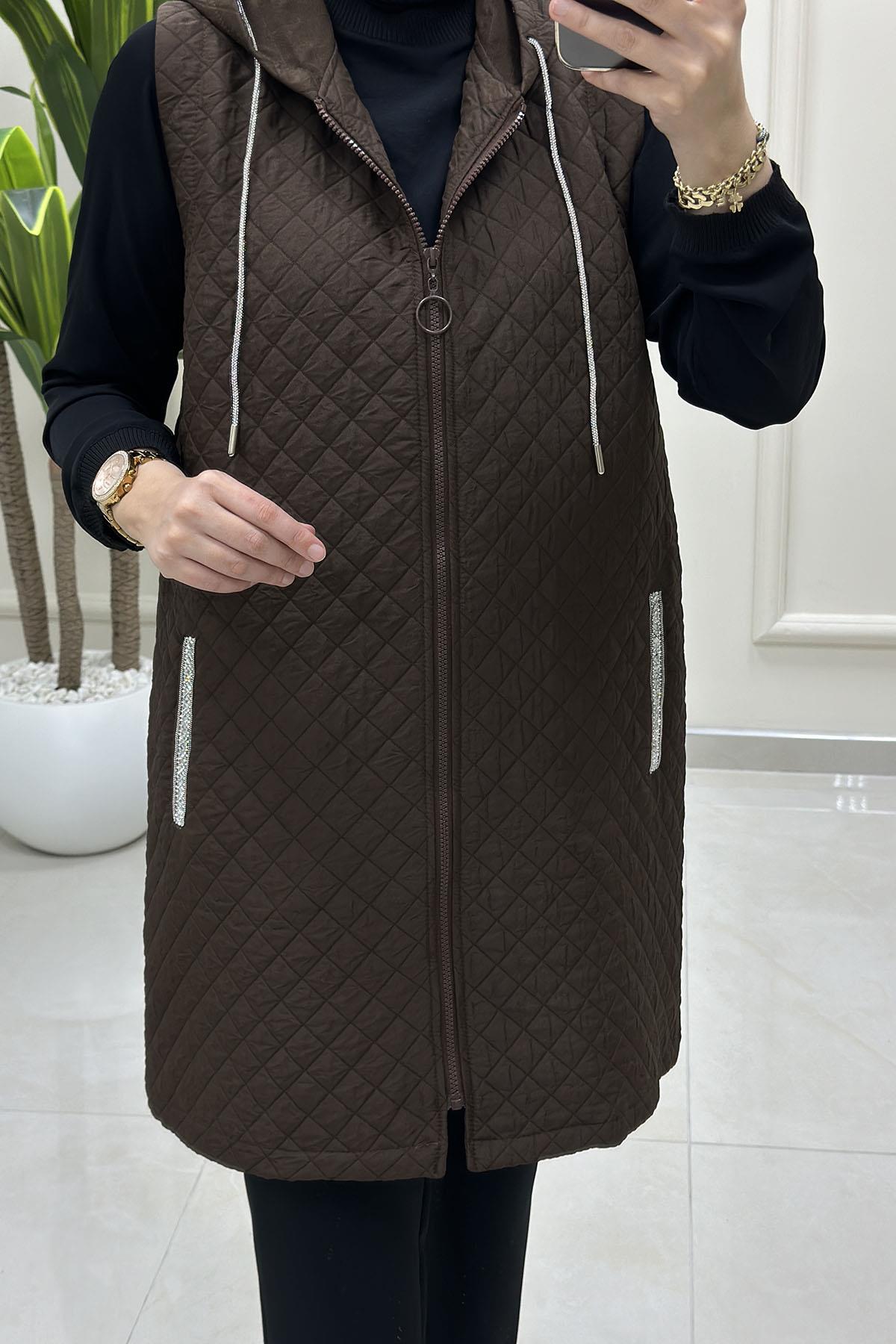 Önü Fermuarlı Kapüşon Taş İpli Kadın Kapitone Yelek Kahverengi NOŞHE 4468 (NOŞHE-26K4468)