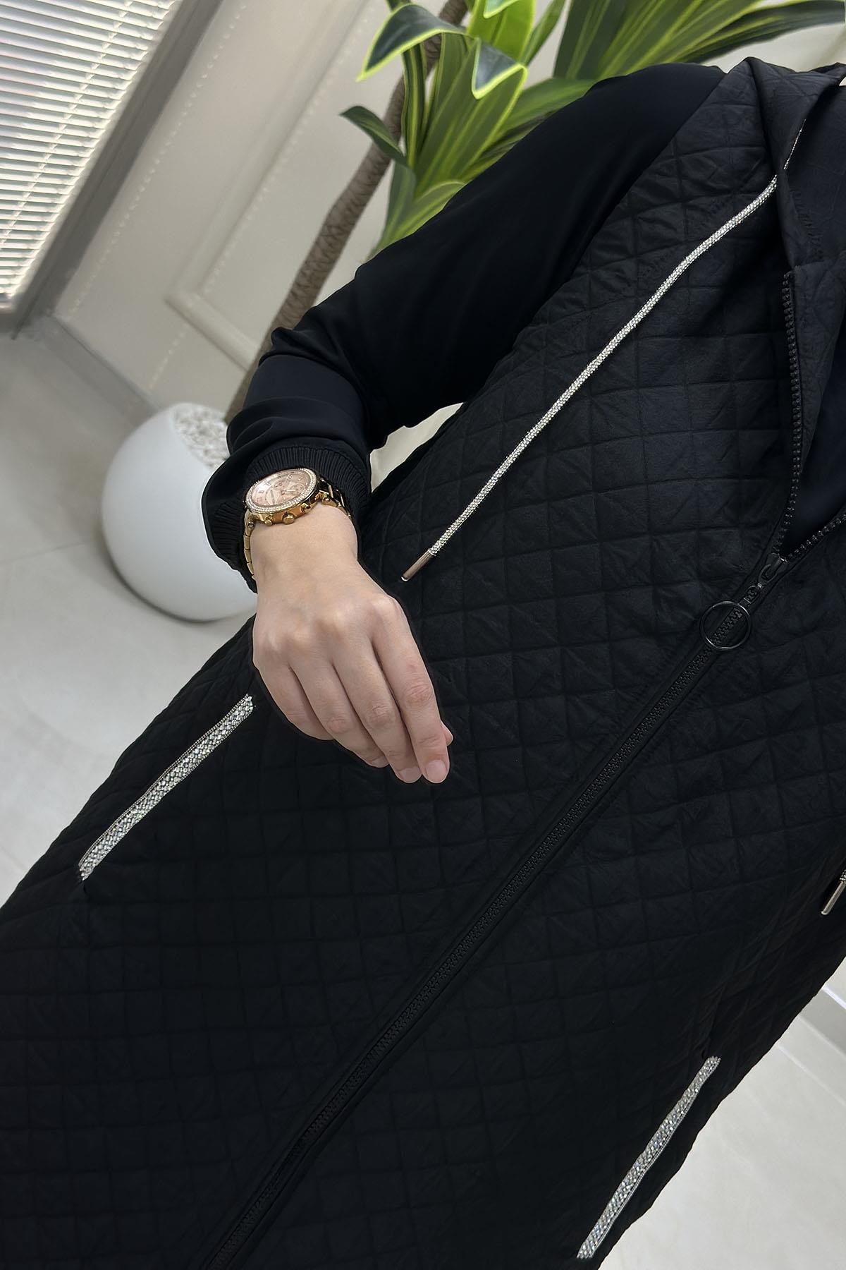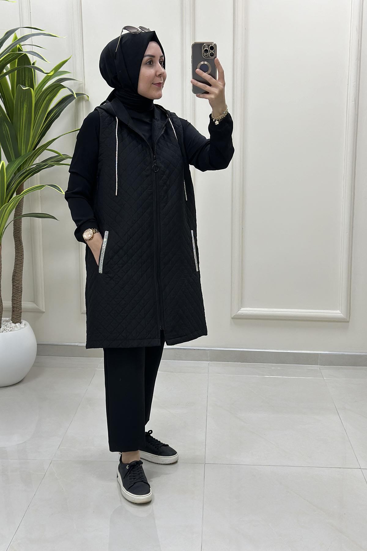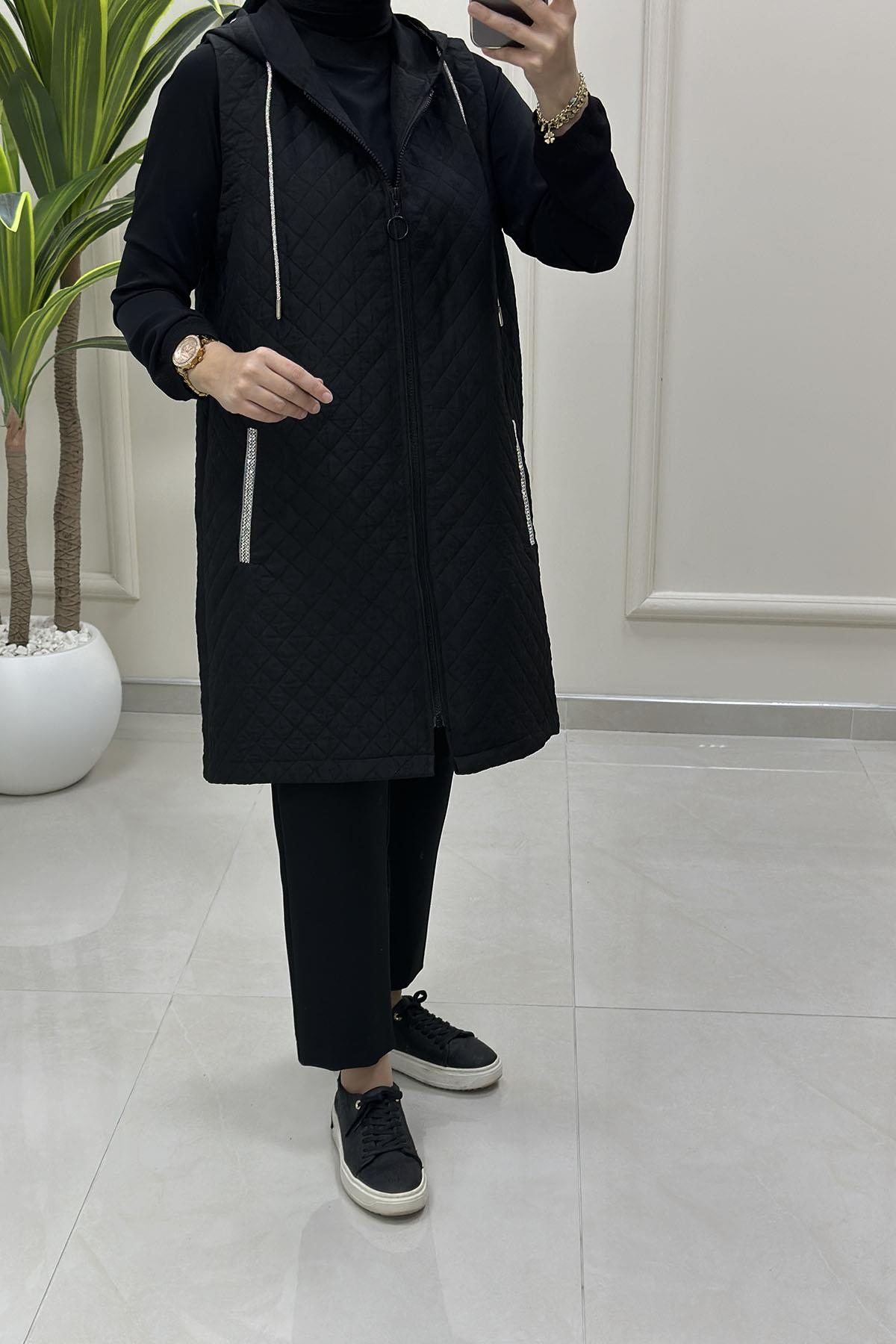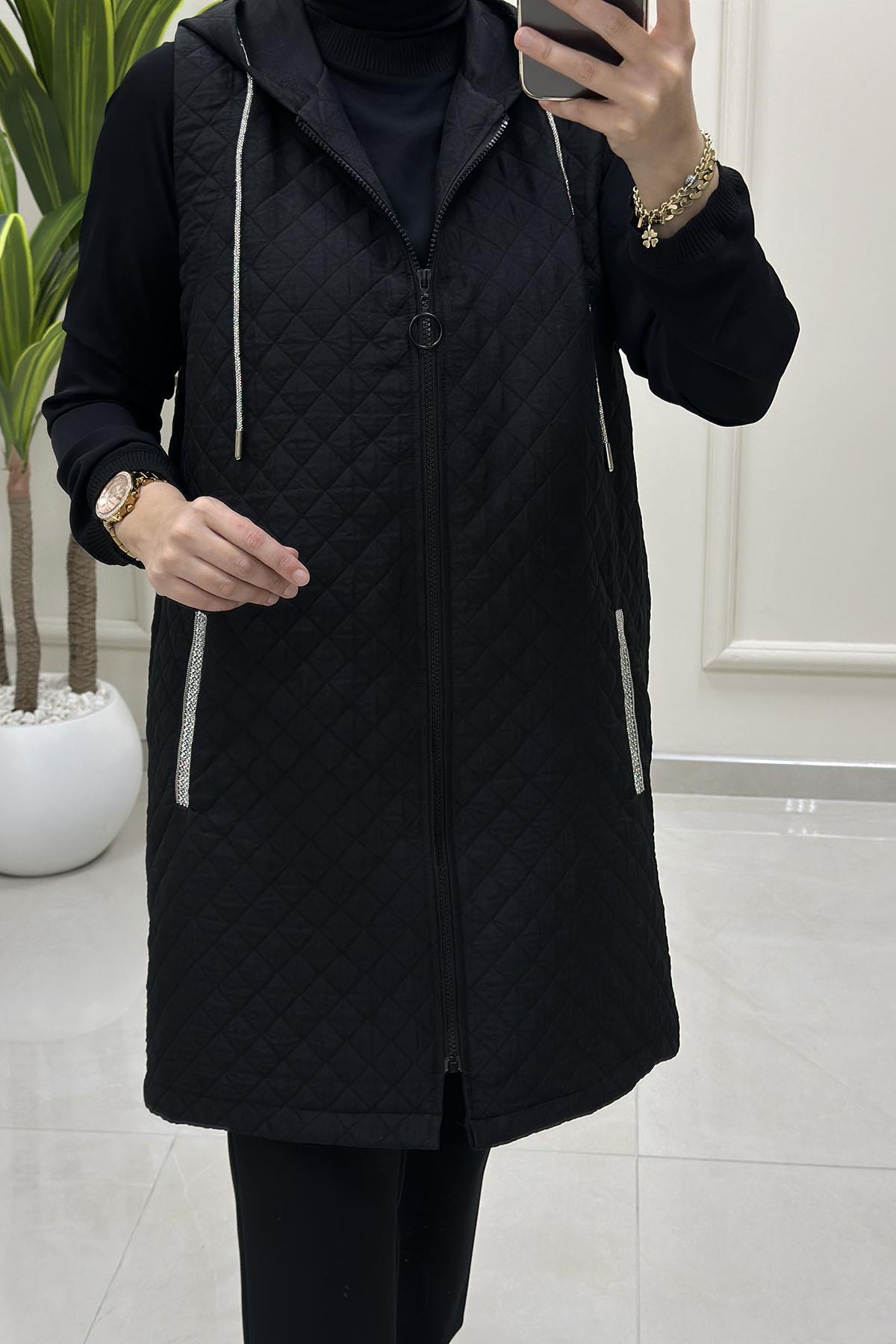 Önü Fermuarlı Kapüşon Taş İpli Kadın Kapitone Yelek Siyah NOŞHE 4468 (NOŞHE-26K4468)