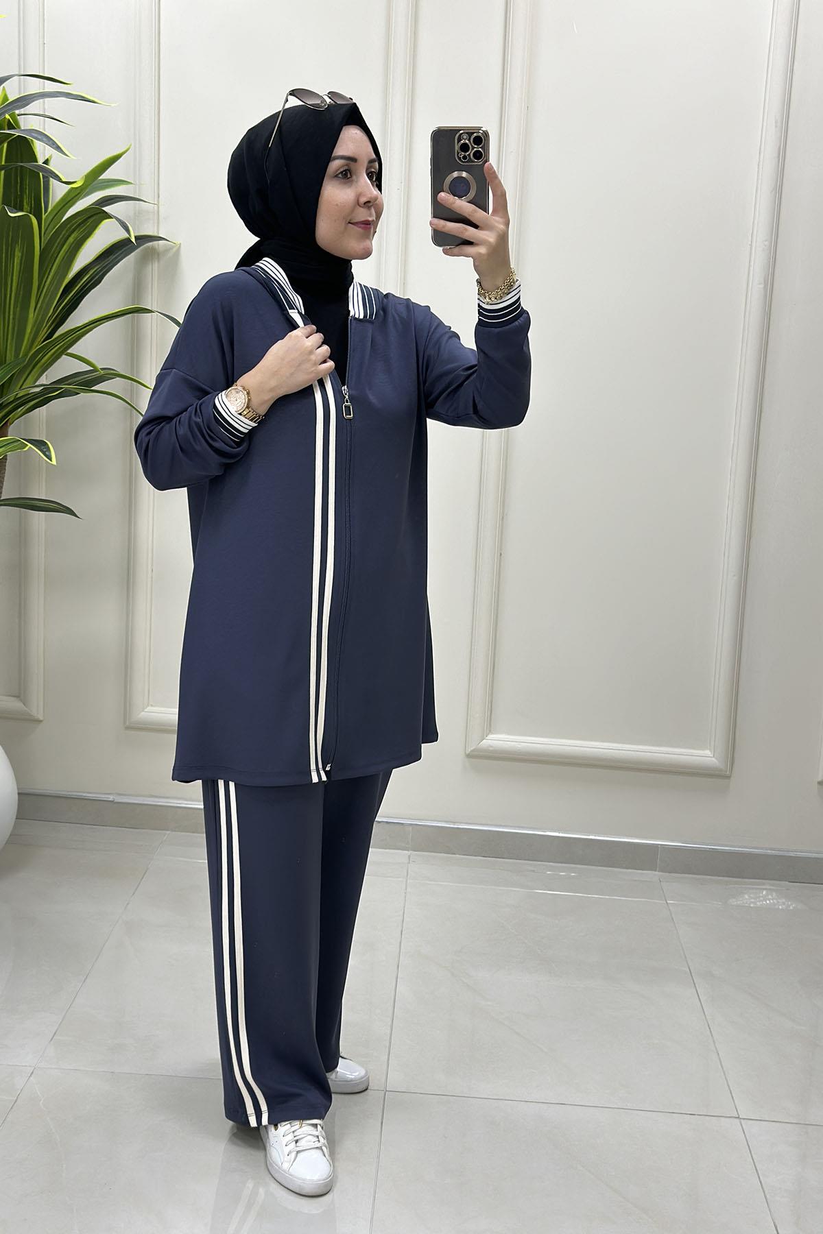 Önü Fermuarlı Kapüşonlu Şerit Garnili Giyçık ve Pantolon Kadın İkili Takım Antrasit KADO 257402 (KADO-26K257402)
