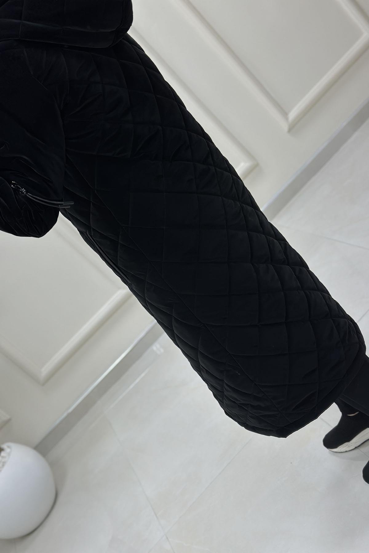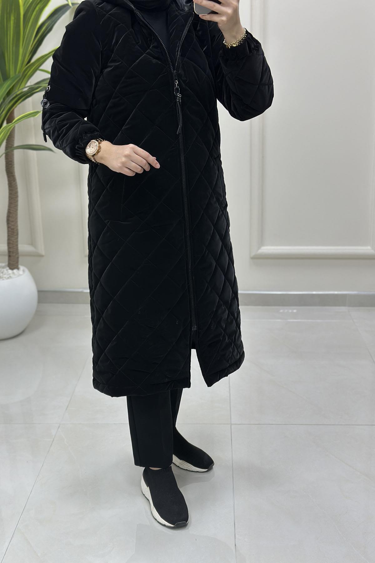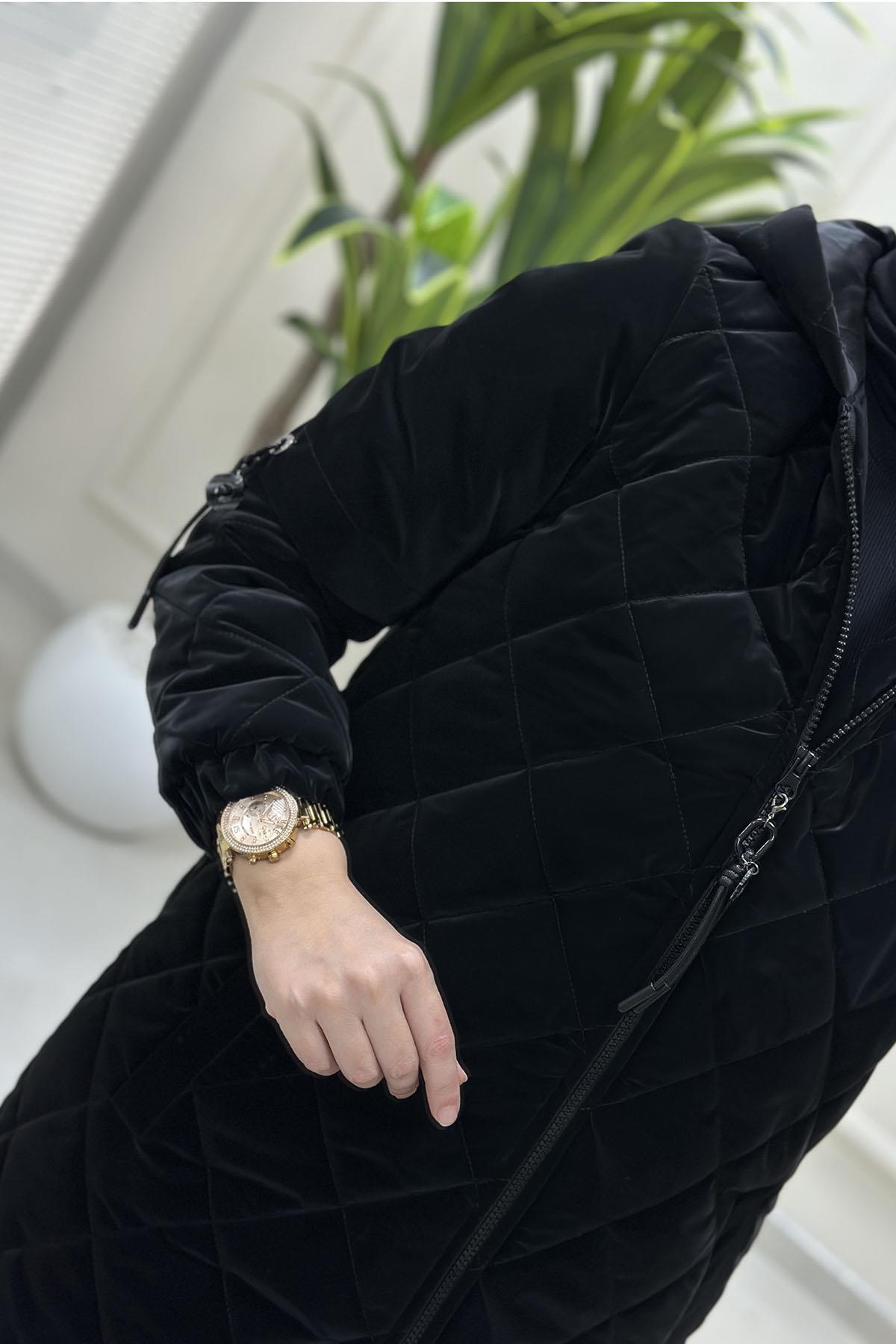 Önü Fermuarlı Kolları Aksesuar Detaylı Kadın Kapitone Kaban Siyah MLH 4613 (MLH-26K4613)