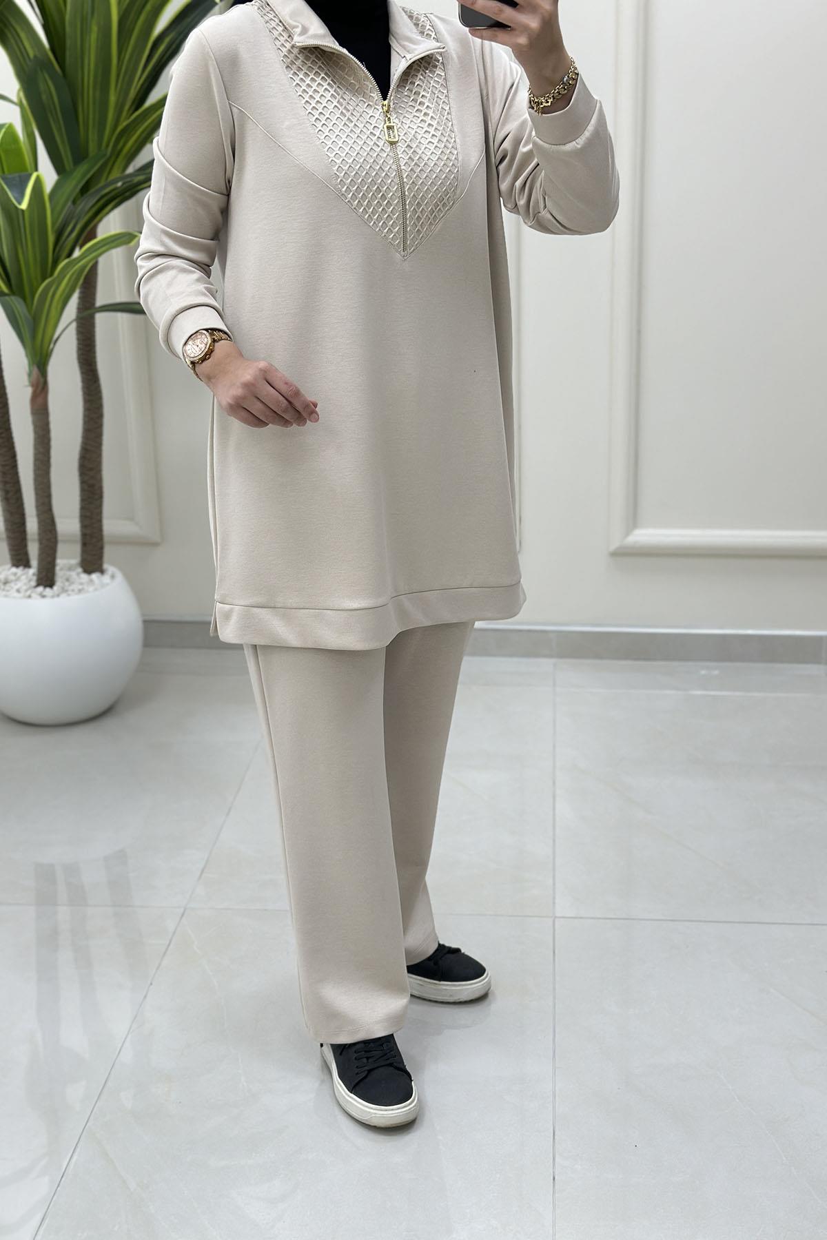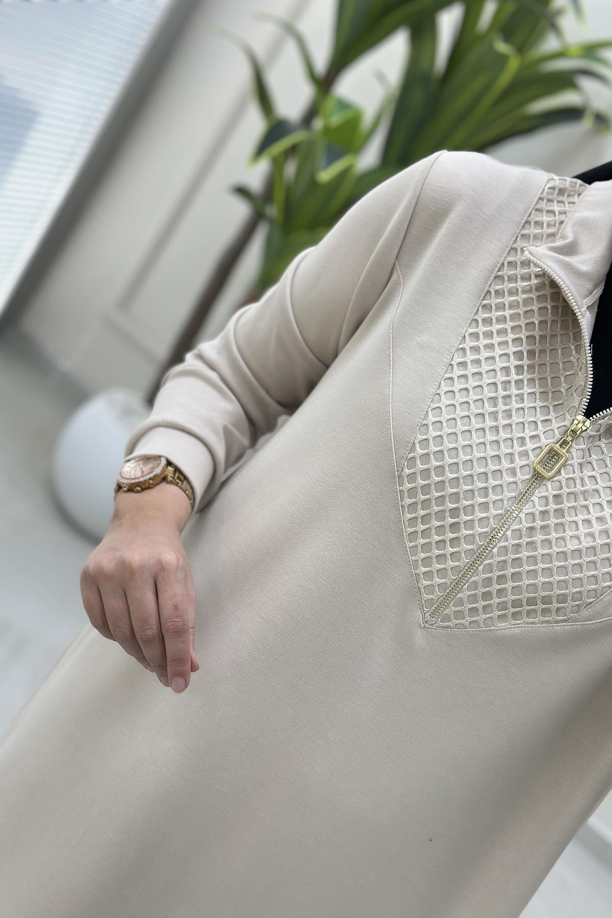Önü File ve Fermuar Detaylı Tunik ve Pantolon Kadın İkili Takım Bej KADO 5126 (KADO-26K5126)