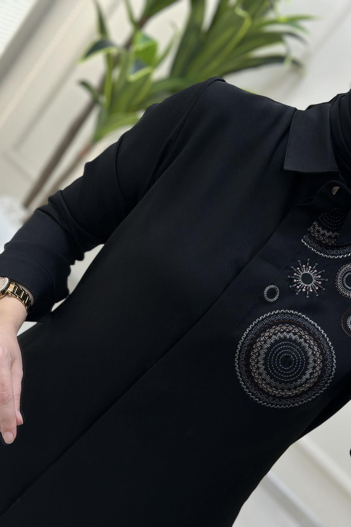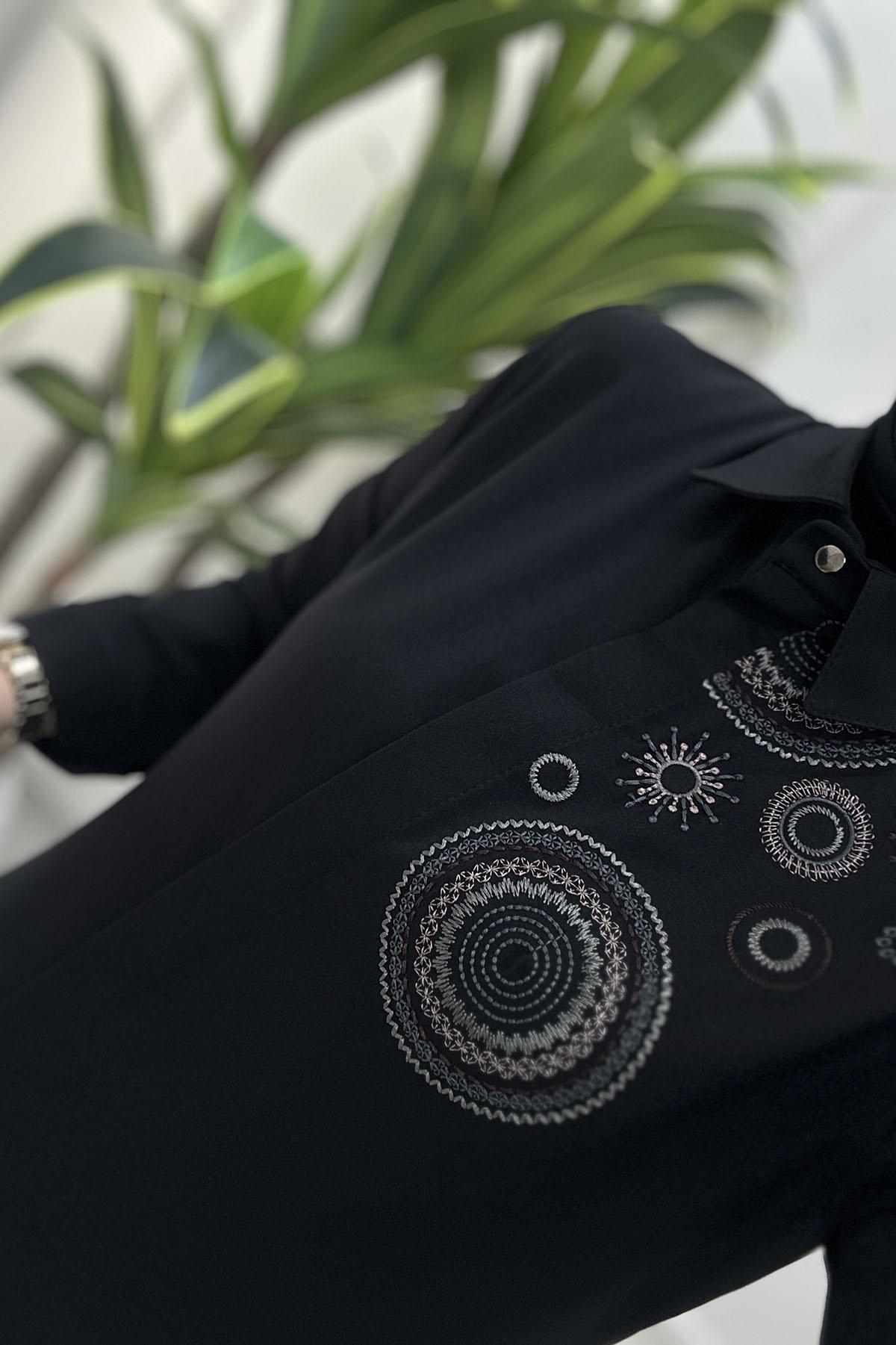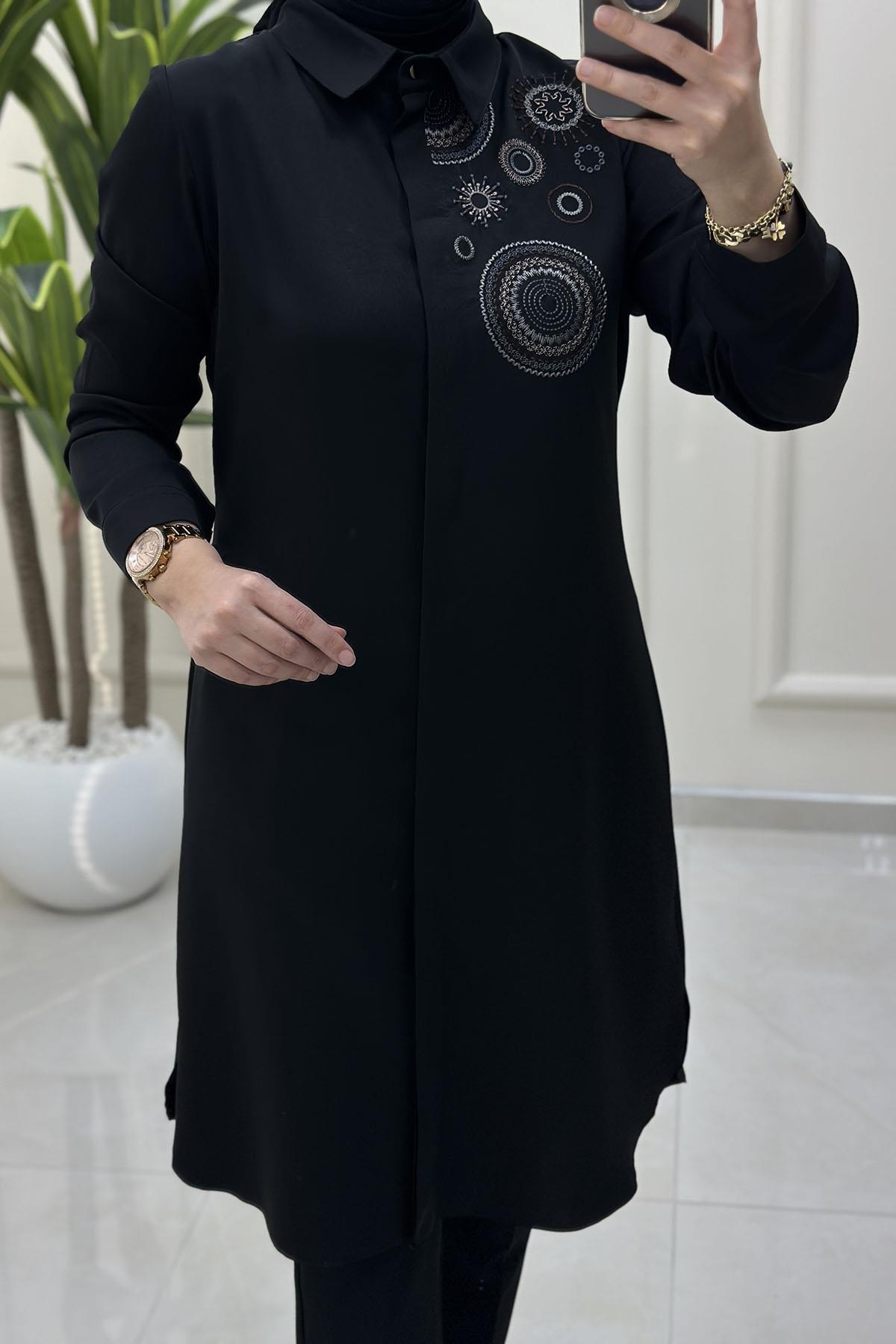 Önü Gizli Düğme Nakış Detaylı Kadın Tunik Siyah QTN 2986 (QTN-26K2986)