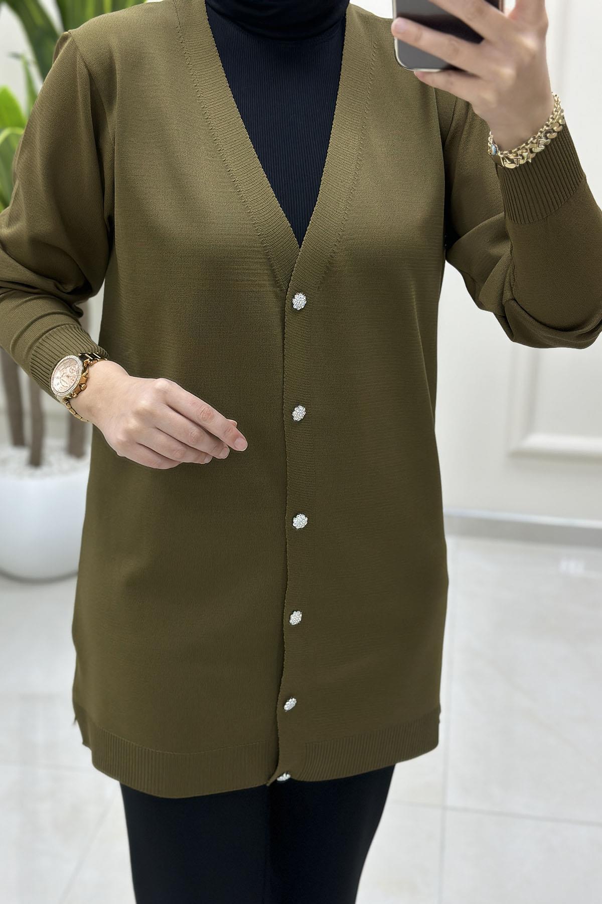 Önü Taş Düğmeli Kadın Triko Hırka Haki MLH 5024 (MLH-26K5024)