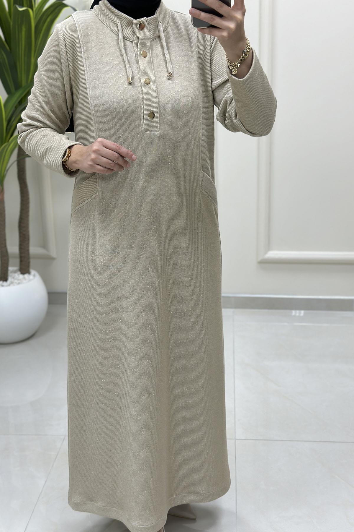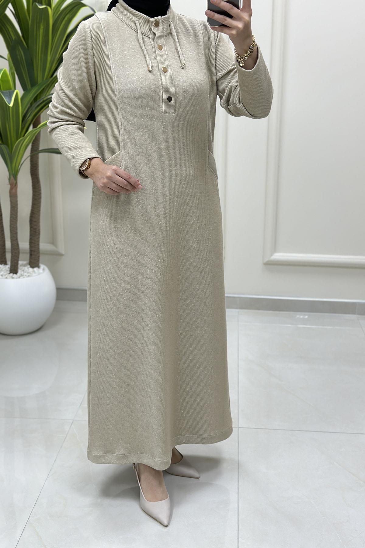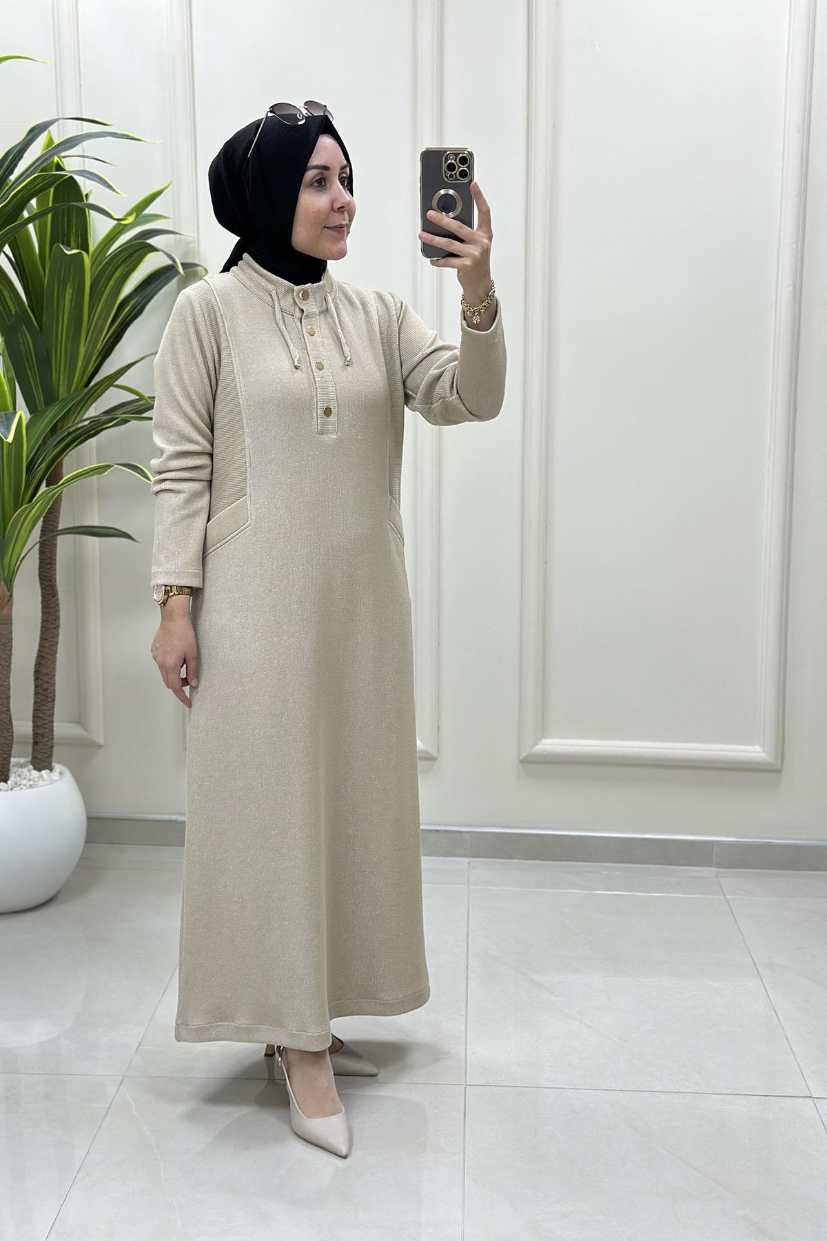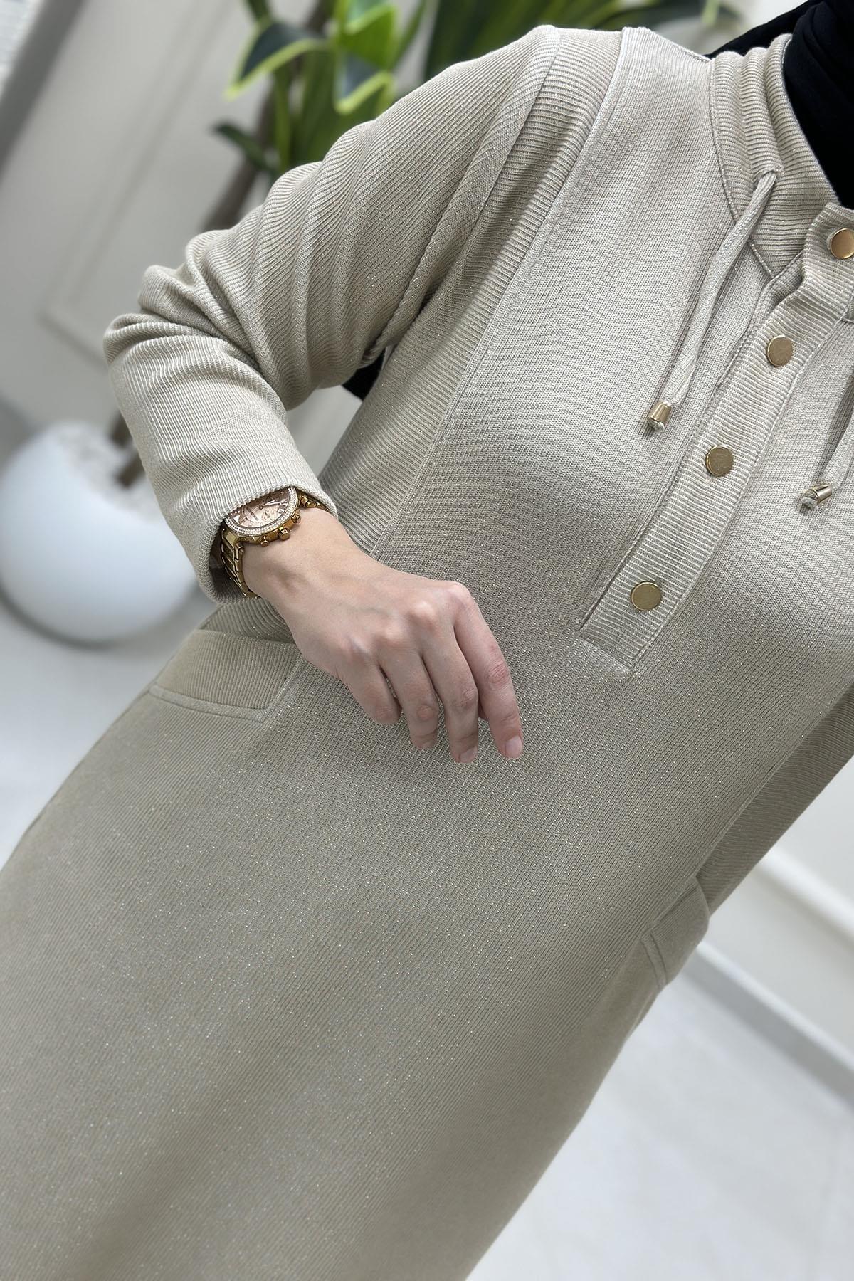 Önü Yarım Düğmeli İpli Örme Kadın Elbise Bej ALS 5218 (ALS-26K5218)