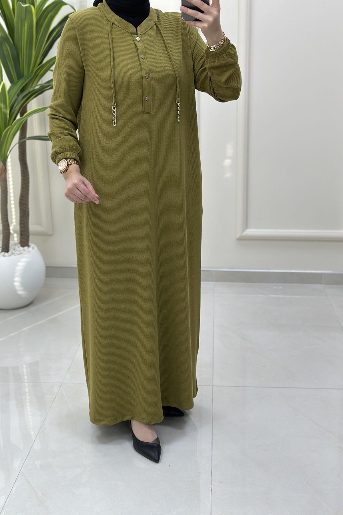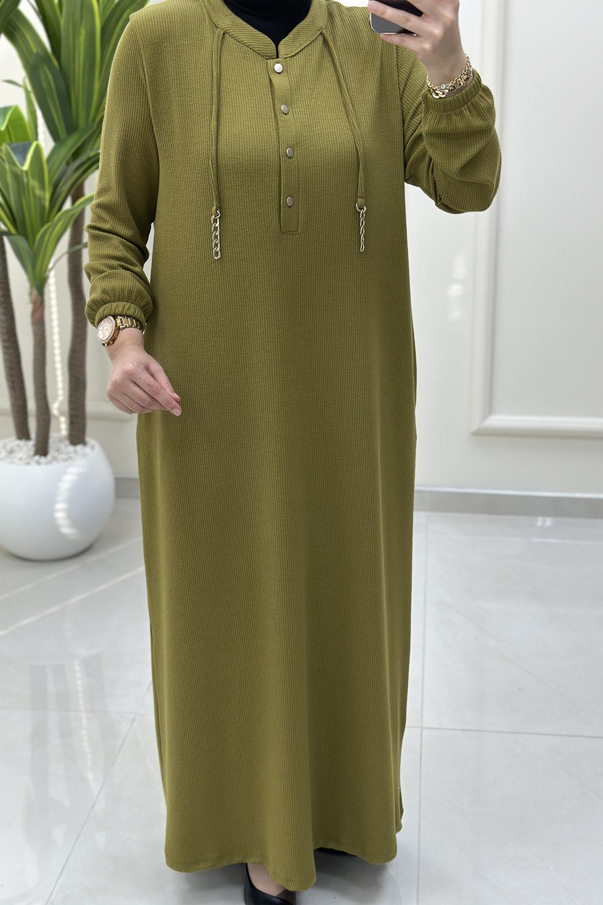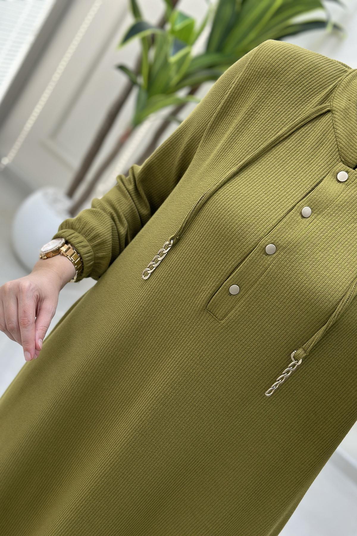 Önü Yarım Düğmeli Zincir Detaylı Kadın Elbise Yağ Yeşili KADO 257624 (KADO-26K257624)