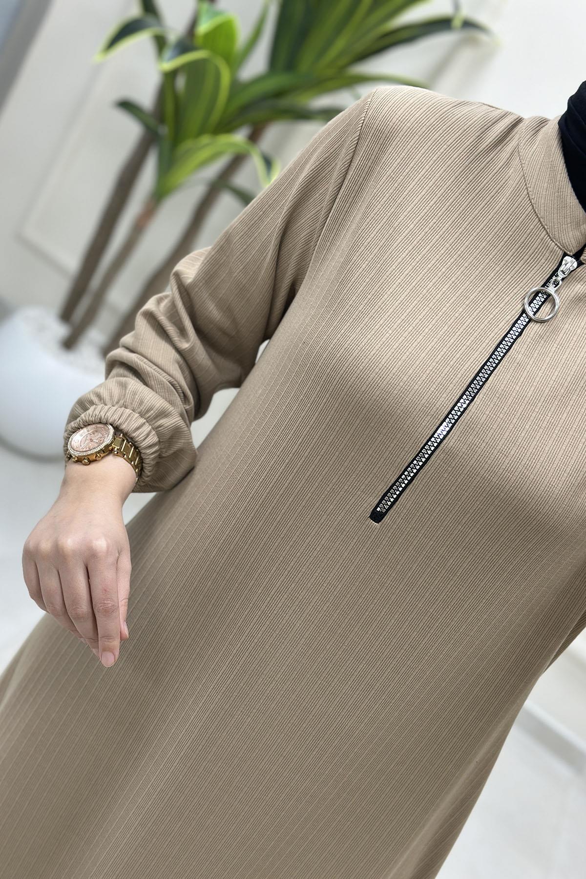 Önü Yarım Fermuarlı Kolu Lastikli Kadın Elbise Bej MP 2661 (MP-26K2661)