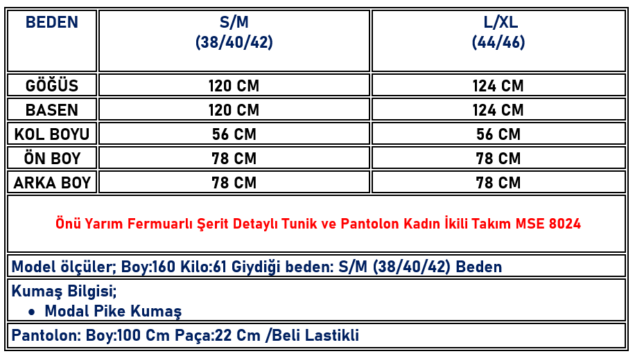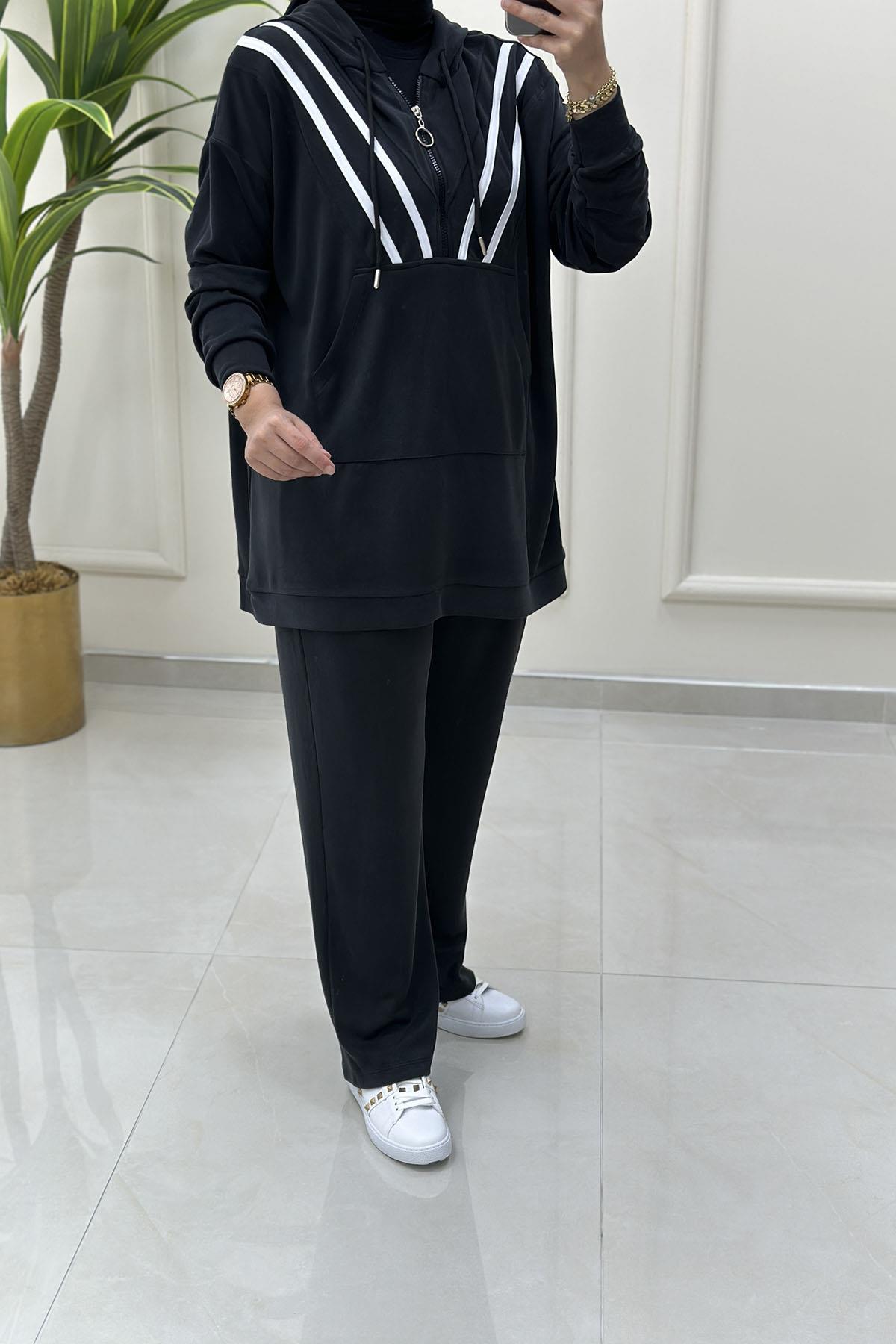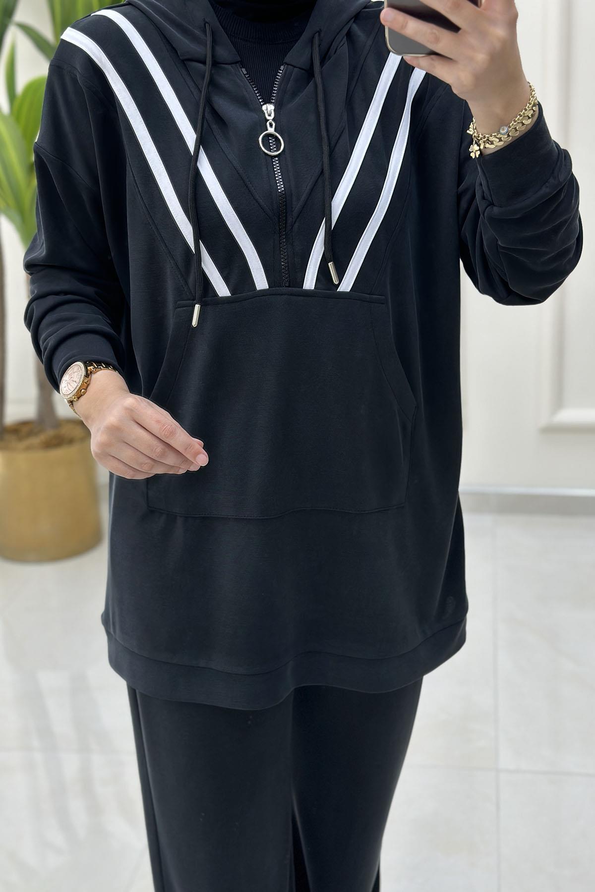 Önü Yarım Fermuarlı Şerit Detaylı Tunik ve Pantolon Kadın İkili Takım Siyah MSE 8024 (MSE-26K8024)