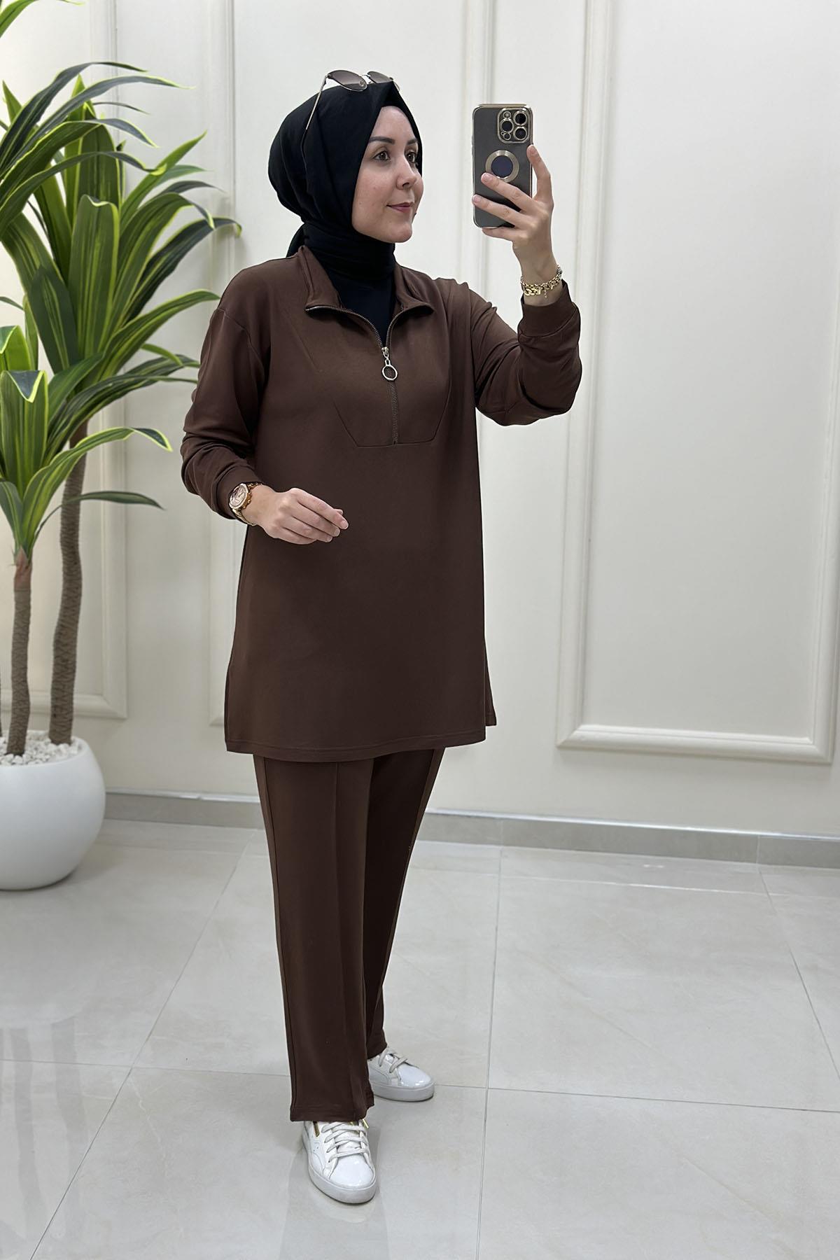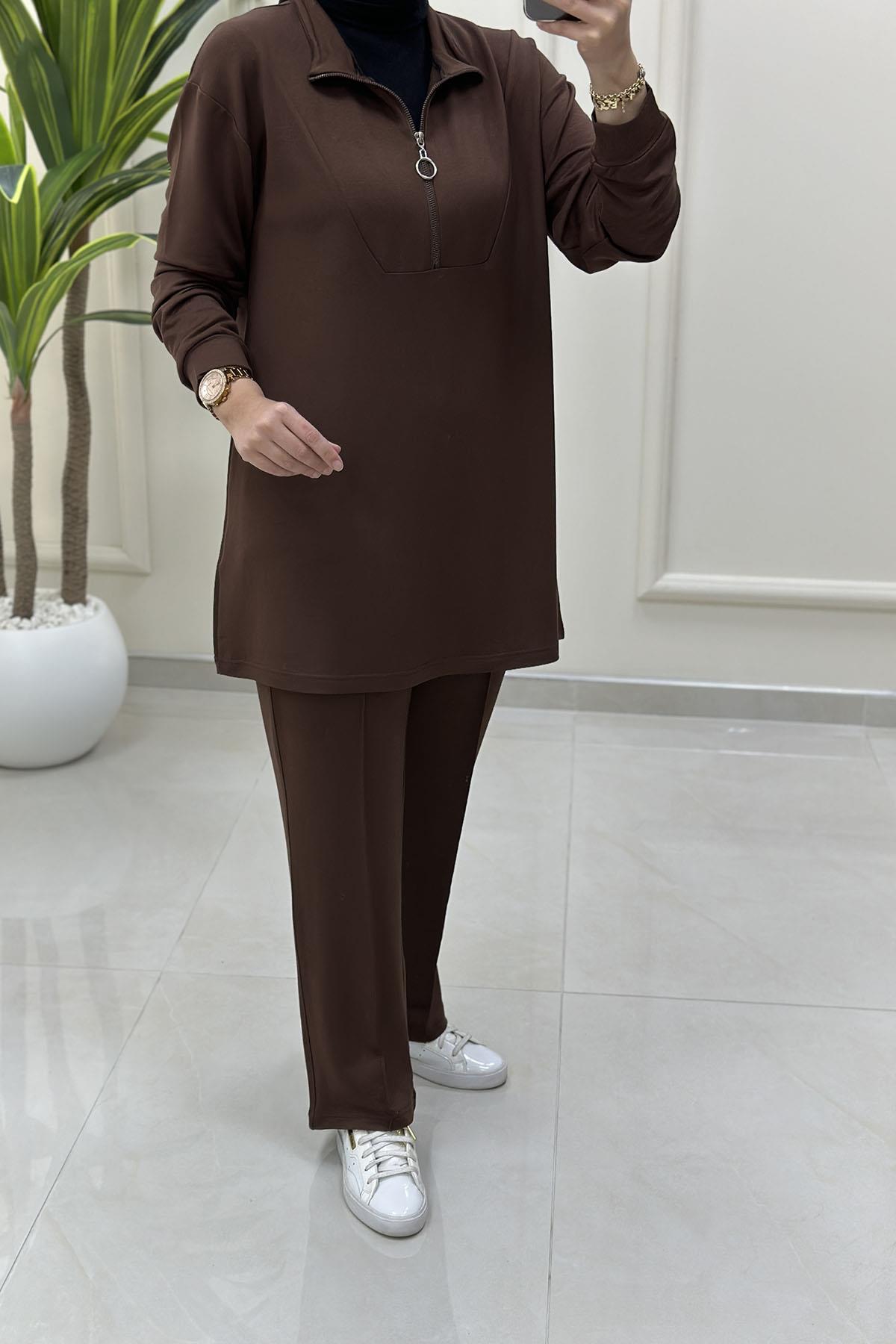 Önü Yarım Fermuarlı Tunik ve Pantolon Kadın İkili Takım Kahverengi KADO 257276 (KADO-26K257276)