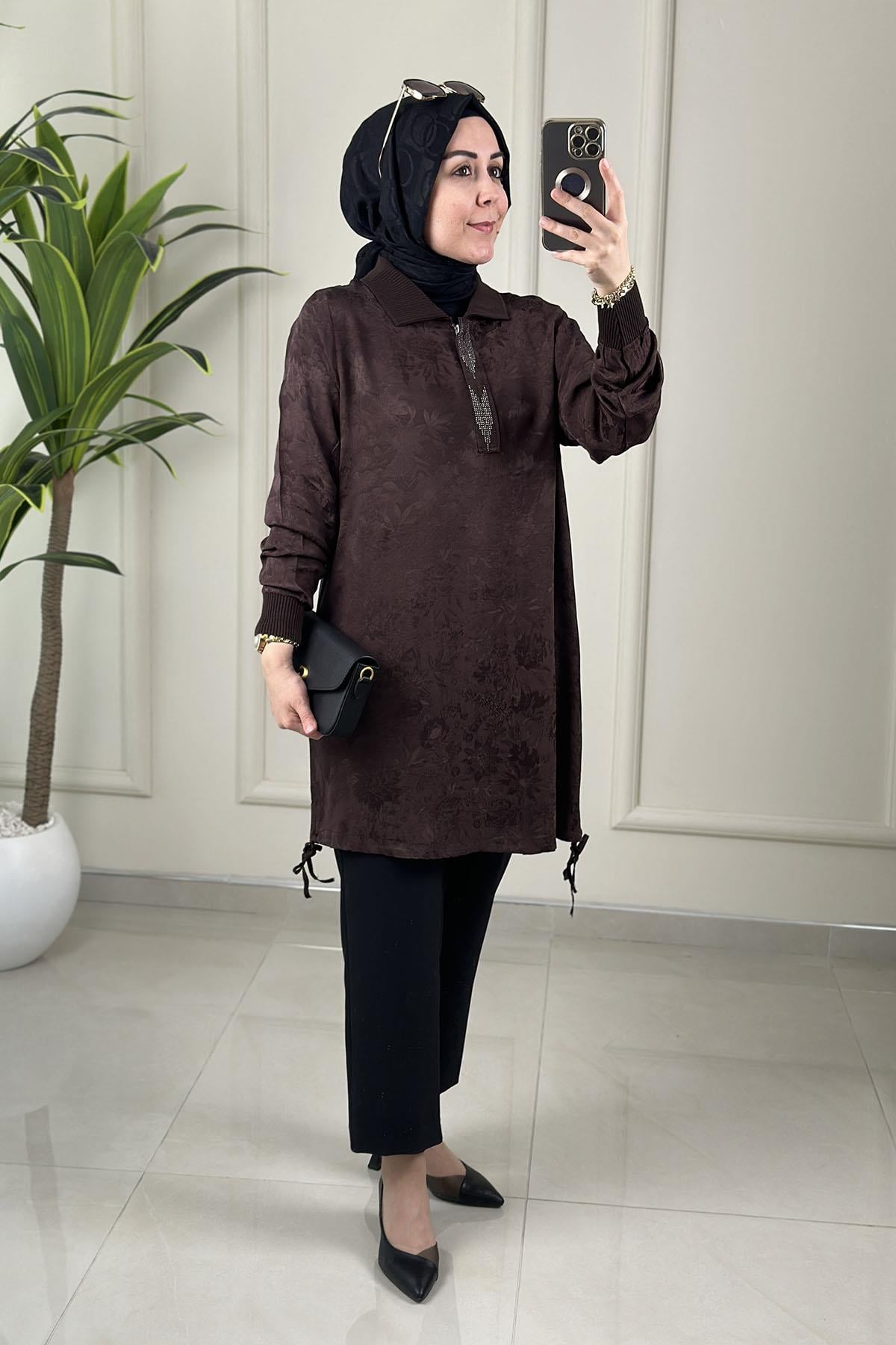 Qupra Önü Yarım Fermuarlı Taş Detaylı Ribanalı Kadın Tunik Acı Kahve KADO 262052