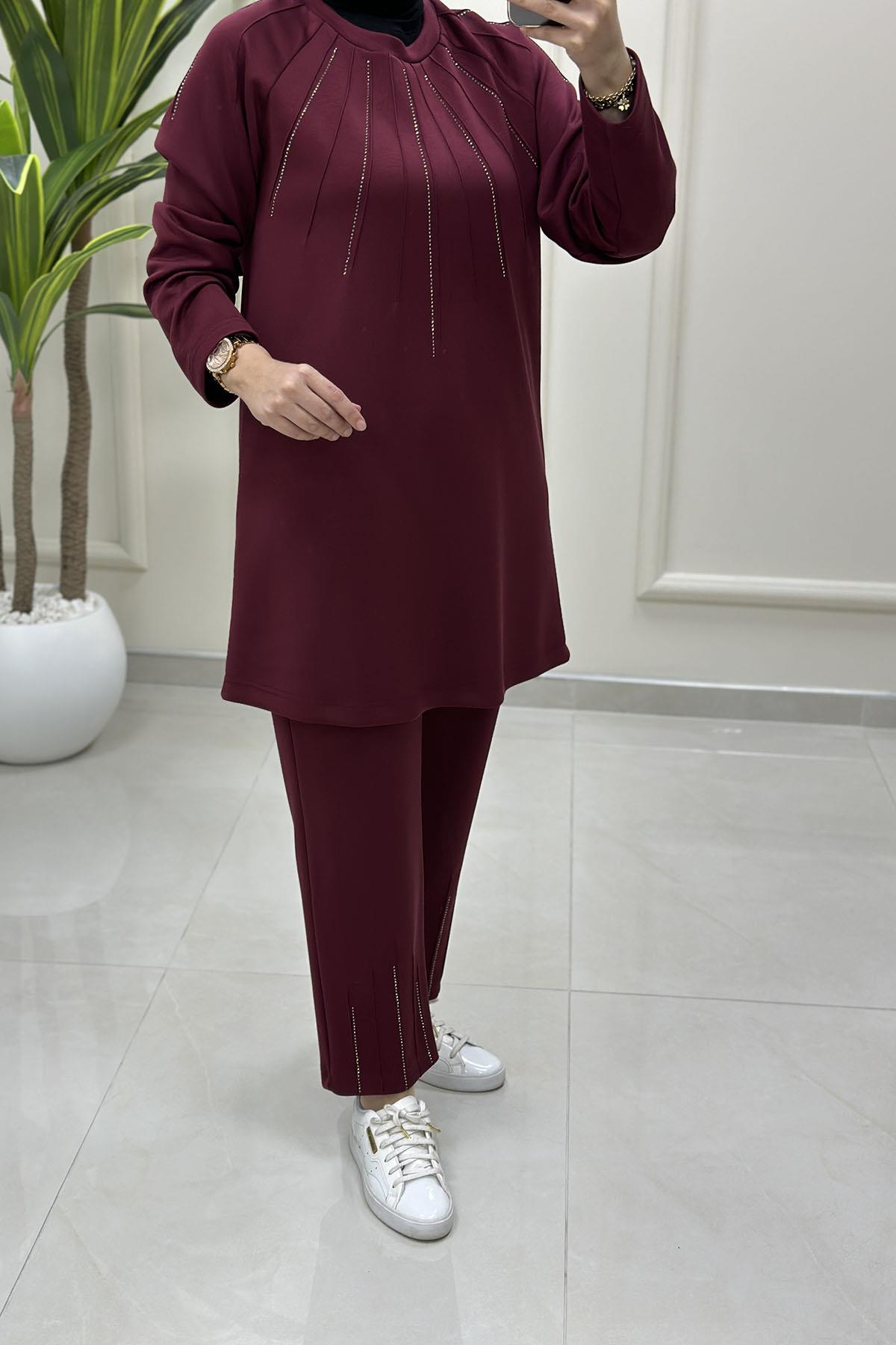 Reglan Kol Tunik ve Pantolon Taş Detaylı Kadın İkili Takım Bordo VOL 1606 (VOL-26K1606)