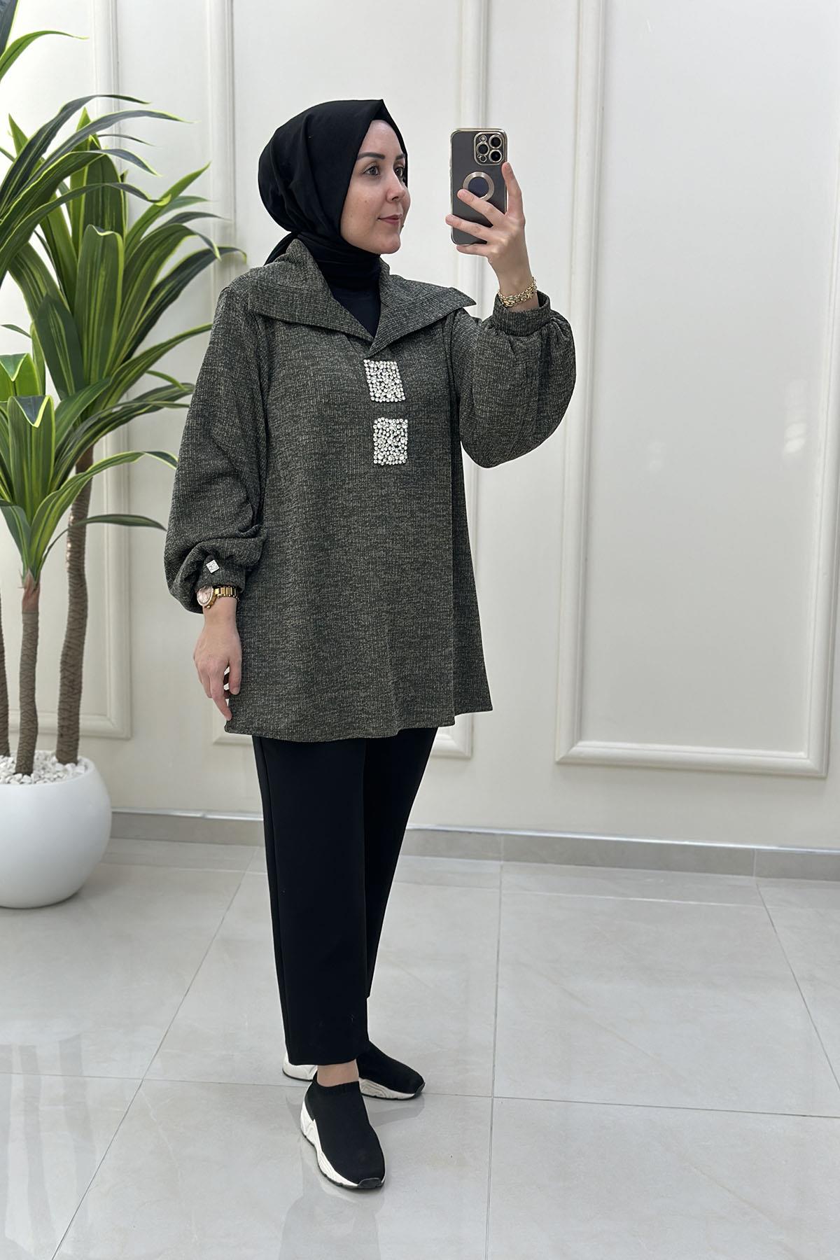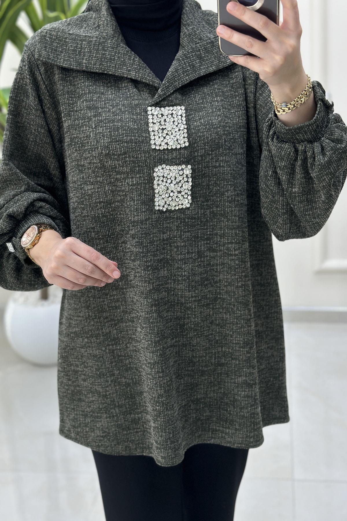 Şal Yaka Taş Detaylı Balon Kol Kadın Örme Tunik Haki MSE 3232 (MSE-26K3232)