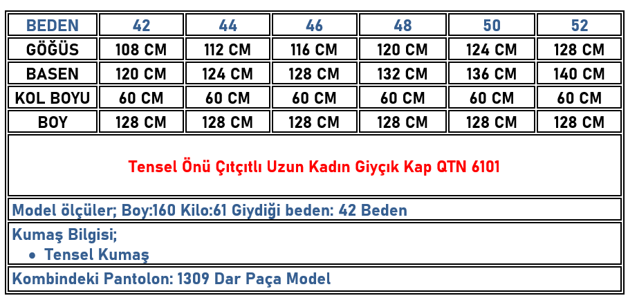 Tensel Önü Çıtçıtlı Uzun Kadın Giyçık Kap Mavi QTN 6101 (QTN-26Y6101)