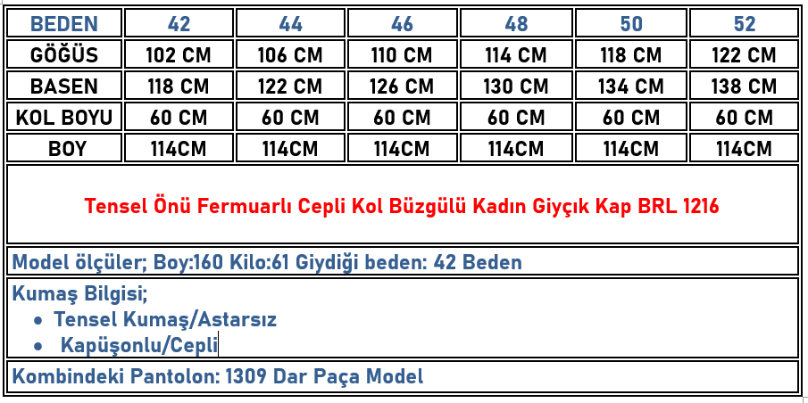 Tensel Önü Fermuarlı Cepli Kol Büzgülü Kadın Giyçık Kap Siyah BRL 1216