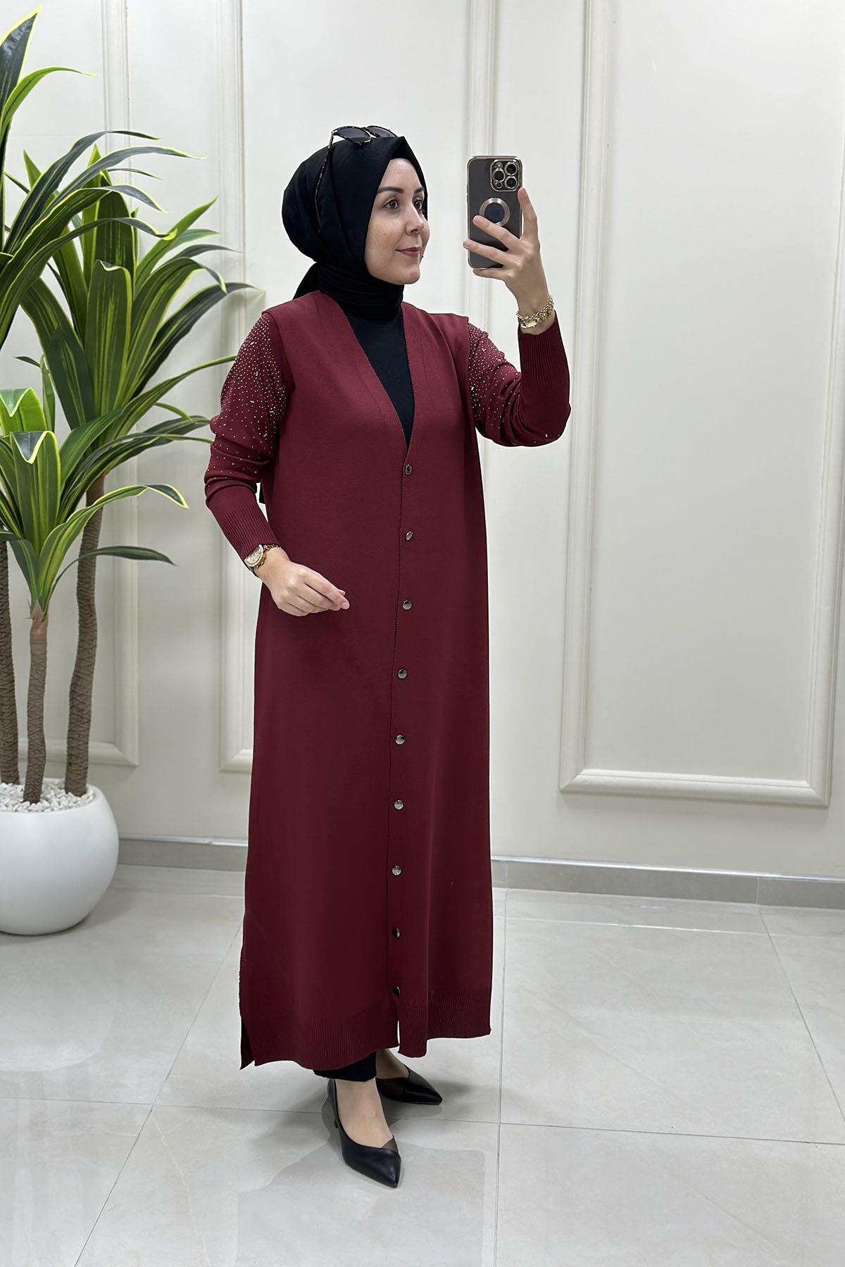 Triko Önü Düğmeli Kolu Taş Detaylı Kadın Uzun Hırka Bordo KADO 2725003 (KADO-26K2725003)