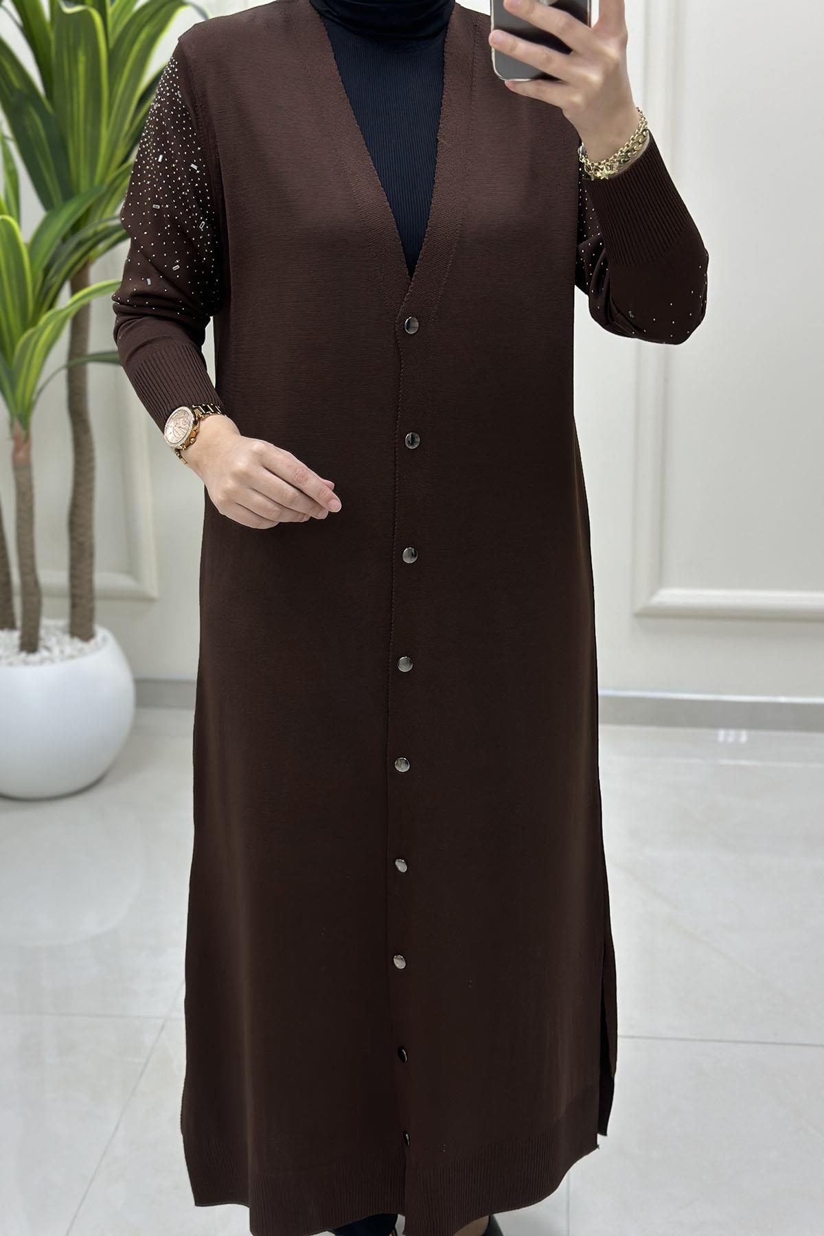 Triko Önü Düğmeli Kolu Taş Detaylı Kadın Uzun Hırka Kahverengi KADO 2725003 (KADO-26K2725003)