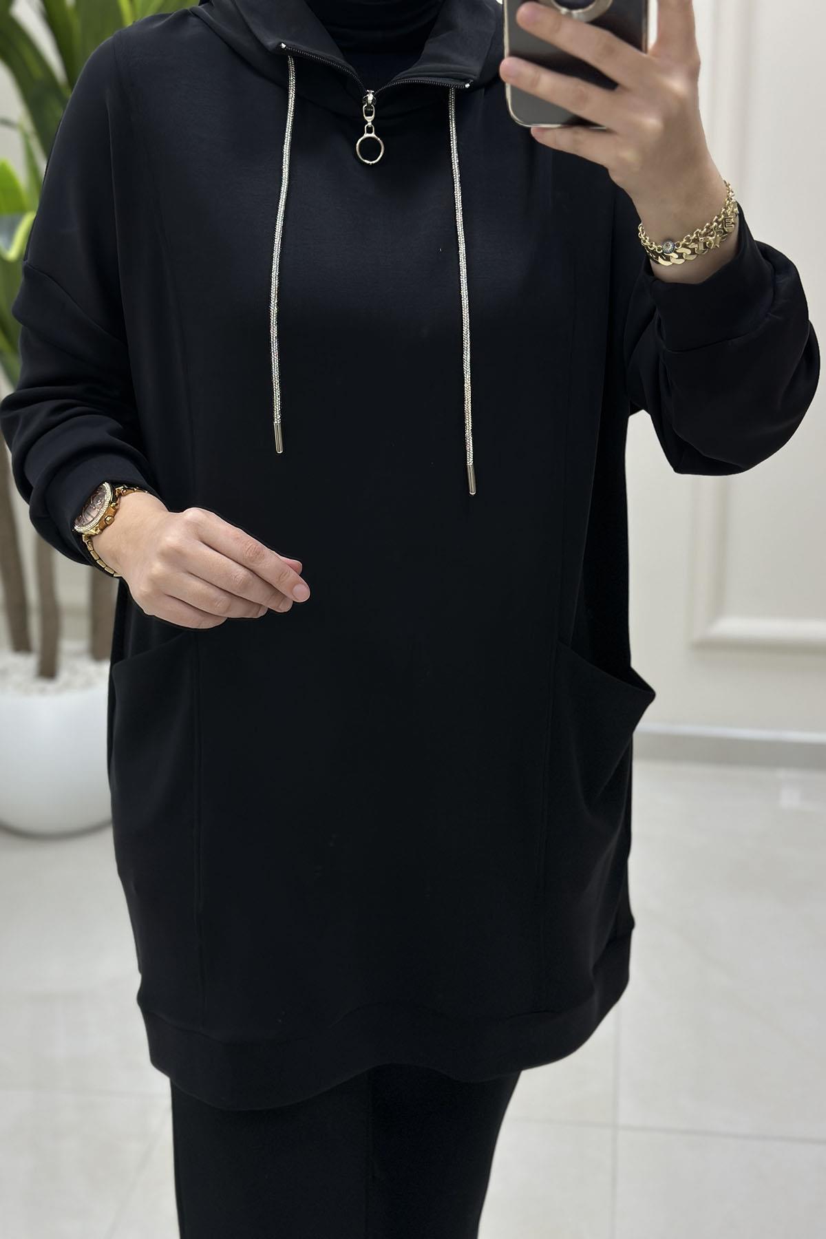 Yaka Fermuarlı Taş İpli Önü Cepli Oysho Kadın Tunik Siyah MSE 3069 (MSE-26K3069)