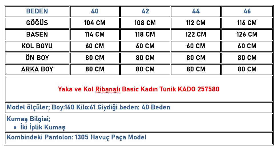 Yaka ve Kol Ribanalı Basic Kadın Tunik Mavi KADO 257580 (KADO-26K257580)