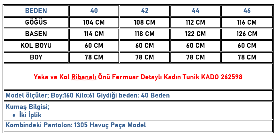 Yaka ve Kol Ribanalı Önü Fermuar Detaylı Kadın Tunik Taş KADO 262598