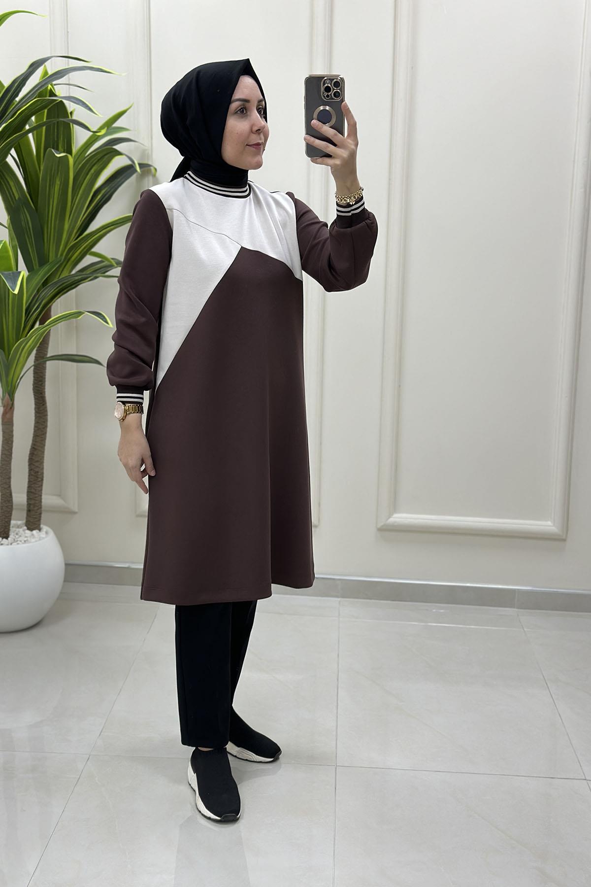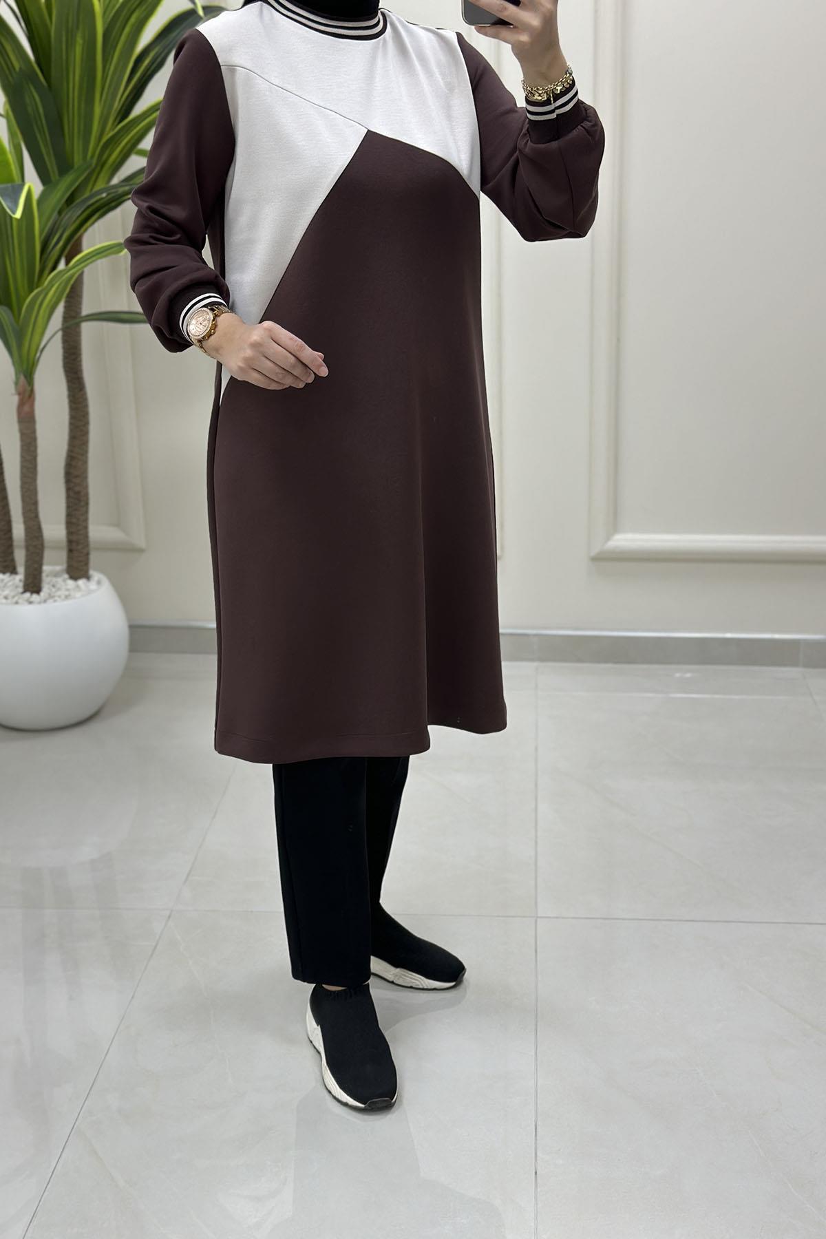 Yaka ve Kol Ribanalı Renk Garnili Kadın Modal Tunik Kahverengi ALS 4841 (ALS-26K4841)