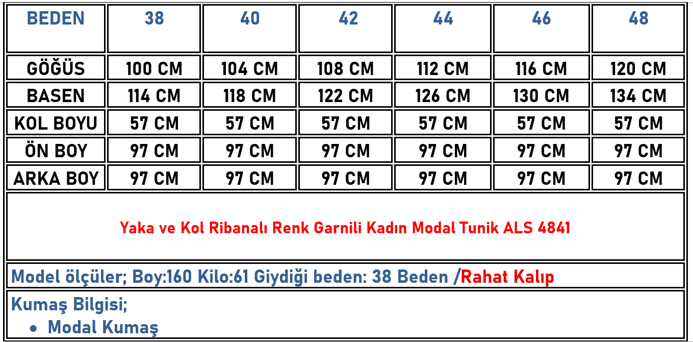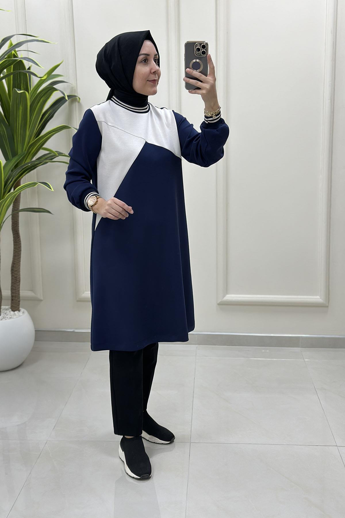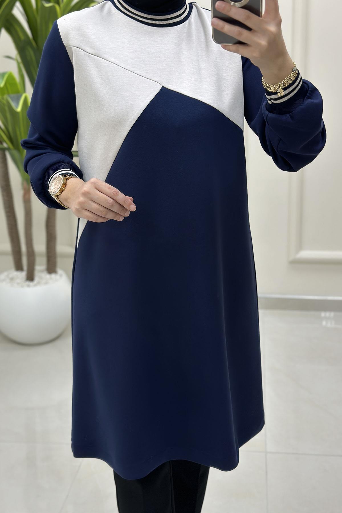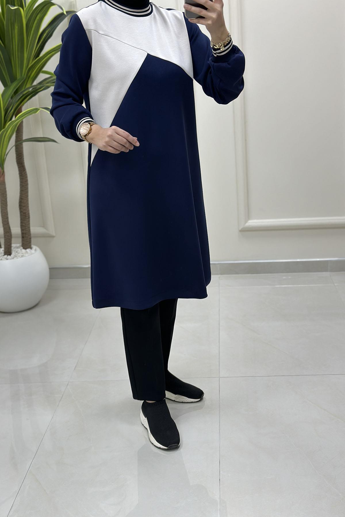 Yaka ve Kol Ribanalı Renk Garnili Kadın Modal Tunik Lacivert ALS 4841 (ALS-26K4841)
